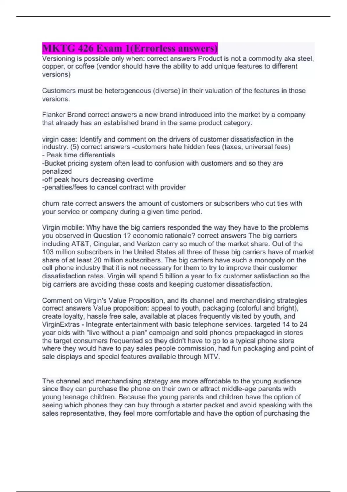 Versioning is possible only when: correct answers Product is not a commodity aka steel, copper, or coffee (vendor should have the ability to add unique features to different versions) Customers must be heterogeneous (diverse) in their valuation of the features in those versions. Flanker Brand correct answers a new brand introduced into the market by a company that already has an established brand in the same product category. virgin case: Identify and comment on the drivers of customer dissatisfaction in the industry. (5) correct answers -customers hate hidden fees (taxes, universal fees) - Peak time differentials -Bucket pricing system often lead to confusion with customers and so they are penalized -off peak hours decreasing overtime -penalties/fees to cancel contract with provider churn rate correct answers the amount of customers or subscribers who cut ties with your service or company during a given time period. Virgin mobile: Why have the big carriers responded the way they have to the problems you observed in Question 1? economic rationale? correct answers The big carriers including AT&T, Cingular, and Verizon carry so much of the market share. Out of the 103 million subscribers in the United States all three of these big carriers have of market share of at least 20 million subscribers. The big carriers have such a monopoly on the cell phone industry that it is not necessary for them to try to improve their customer dissatisfaction rates. Virgin will spend 5 billion a year to fix customer satisfaction so the big carriers are avoiding these costs and keeping customer dissatisfaction. Comment on Virgin's Value Proposition, and its channel and merchandising strategies correct answers Value proposition: appeal to youth, packaging (colorful and bright), create loyalty, hassle free sale, available at places frequently visited by youth, and VirginExtras - Integrate entertainment with basic telephone services. targeted 14 to 24 year olds with "live without a plan" campaign and sold phones prepackaged in stores the target consumers frequented so they didn't have to go to a typical phone store where they would have to pay sales people commission, had fun packaging and point of sale displays and special features available through MTV. The channel and merchandising strategy are more affordable to the young audience since they can purchase the phone on their own or attract middle-age parents with young teenage children. Because the young parents and children have the option of seeing which phones they can buy through a starter packet and avoid speaking with the sales representative, they feel more comfortable and have the option of purchasing the