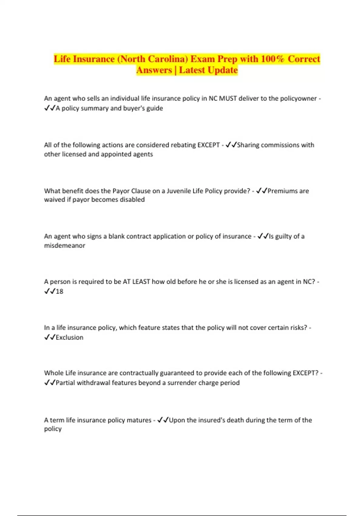 Life Insurance (North Carolina) Exam Prep with 100% Correct Answers | Latest Update