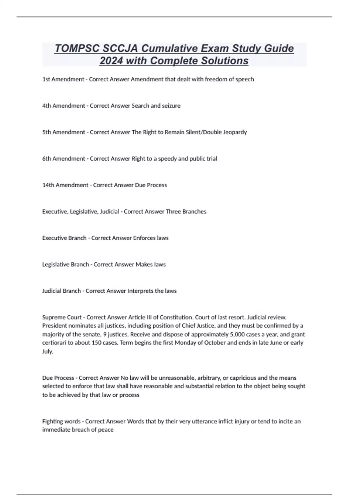 TOMPSC SCCJA Cumulative Exam Study Guide 2024 with Complete Solutions 1st Amendment - Correct Answer Amendment that dealt with freedom of speech 4th Amendment - Correct Answer Search and seizure 5th Amendment - Correct Answer The Right to Remain Silent/Double Jeopardy 6th Amendment - Correct Answer Right to a speedy and public trial 14th Amendment - Correct Answer Due Process Executive, Legislative, Judicial - Correct Answer Three Branches Executive Branch - Correct Answer Enforces laws Legislative Branch - Correct Answer Makes laws Judicial Branch - Correct Answer Interprets the laws Supreme Court - Correct Answer Article III of Constitution. Court of last resort. Judicial review. President nominates all justices, including position of Chief Justice, and they must be confirmed by a majority of the senate. 9 justices. Receive and dispose of approximately 5,000 cases a year, and grant certiorari to about 150 cases. Term begins the first Monday of October and ends in late June or early July. Due Process - Correct Answer No law will be unreasonable, arbitrary, or capricious and the means selected to enforce that law shall have reasonable and substantial relation to the object being sought to be achieved by that law or process Fighting words - Correct Answer Words that by their very utterance inflict injury or tend to incite an immediate breach of peace
