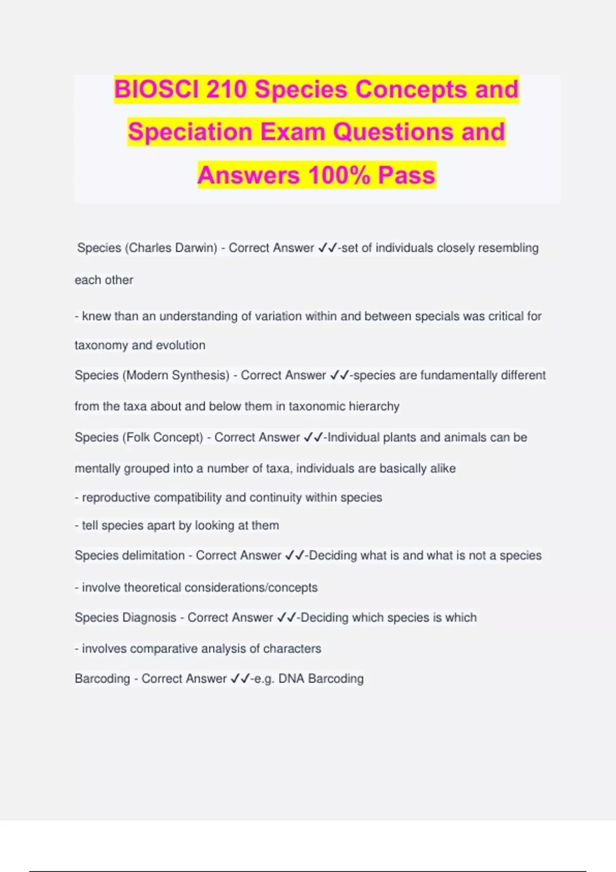 BIOSCI 210 Species Concepts and Speciation Exam Questions and Answers 100% Pass Species (Charles Darwin) - Correct Answer ️️ -set of individuals closely resembling each other - knew than an understanding of variation within and between specials was critical for taxonomy and evolution Species (Modern Synthesis) - Correct Answer ️️ -species are fundamentally different from the taxa about and below them in taxonomic hierarchy Species (Folk Concept) - Correct Answer ️️ -Individual plants and animals can be mentally grouped into a number of taxa, individuals are basically alike - reproductive compatibility and continuity within species - tell species apart by looking at them Species delimitation - Correct Answer ️️ -Deciding what is and what is not a species - involve theoretical considerations/concepts Species Diagnosis - Correct Answer ️️ -Deciding which species is which - involves comparative analysis of characters Barcoding - Correct Answer ️️ -e.g. DNA Barcoding use of short gene sequence from a standardised region of the genome to help discover, characterise and distinguish species - used to assign unidentified individuals to species - used to DIAGNOSE species - no known way to delimit species Biological Species Concept (BSC) - Correct Answer ️️ -Mayr (1942) - species of actually or potentially interbreeding natural populations which are reproductively isolated - species = reproductive community - inbreeding is a criterion PROBLEMS - plants are problematic due to hybridisation - does not apply to asexual organisms or self-pollinators - inapplicable in practice (impractical breeding experiments) - inconclusive breeding experiments (cannot duplicate natural conditions) - strong adherents use phonetic similarities and discontinuities for delimiting species) - Sexual compatibility is a primitive trait - groups not occurring together in time cannot be evaluated - confuses the product of speciation with the process (criteria ignore selection, drift etc) e.g. salamanders - breed with all neighbours except one species Genotypic Cluster Concept - Correct Answer ️️ -- species = genetic or morphological clusters - no infraspecific variation, can define locally adapted populations as valid species Recognition Species Concept - Correct Answer ️️ -- based on the notion that species form units that are discrete or cohesive in terms of genotype, phenotype or gene flow - understanding why an isolating barrier arose requires examining permeating behaviours that facilitate reproduction - species = the most inclusive population of individual biparental organisms which share a common fertilisation system" - only consider isolating barriers that involve mating and fertilisation - can't explain hybridisation but no introgression Phenotypic Cohesion Concept - Correct Answer ️️ -- species = most inclusi