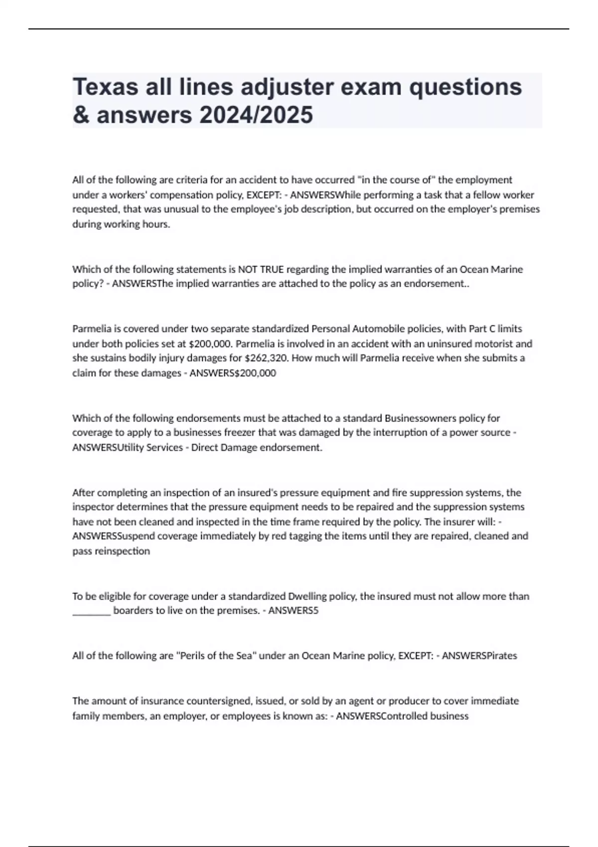 Texas all lines adjuster exam questions & answers 2024/2025 All of the following are criteria for an accident to have occurred "in the course of" the employment under a workers' compensation policy, EXCEPT: - ANSWERSWhile performing a task that a fellow worker requested, that was unusual to the employee's job description, but occurred on the employer's premises during working hours. Which of the following statements is NOT TRUE regarding the implied warranties of an Ocean Marine policy? - ANSWERSThe implied warranties are attached to the policy as an endorsement.. Parmelia is covered under two separate standardized Personal Automobile policies, with Part C limits under both policies set at $200,000. Parmelia is involved in an accident with an uninsured motorist and she sustains bodily injury damages for $262,320. How much will Parmelia receive when she submits a claim for these damages - ANSWERS$200,000 Which of the following endorsements must be attached to a standard Businessowners policy for coverage to apply to a businesses freezer that was damaged by the interruption of a power source - ANSWERSUtility Services - Direct Damage endorsement. After completing an inspection of an insured's pressure equipment and fire suppression systems, the inspector determines that the pressure equipment needs to be repaired and the suppression systems have not been cleaned and inspected in the time frame required by the policy. The insurer will: - ANSWERSSuspend coverage immediately by red tagging the items until they are repaired, cleaned and pass reinspection To be eligible for coverage under a standardized Dwelling policy, the insured must not allow more than _______ boarders to live on the premises. - ANSWERS5 All of the following are "Perils of the Sea" under an Ocean Marine policy, EXCEPT: - ANSWERSPirates The amount of insurance countersigned, issued, or sold by an agent or producer to cover immediate family members, an employer, or employees is known as: - ANSWERSControlled business