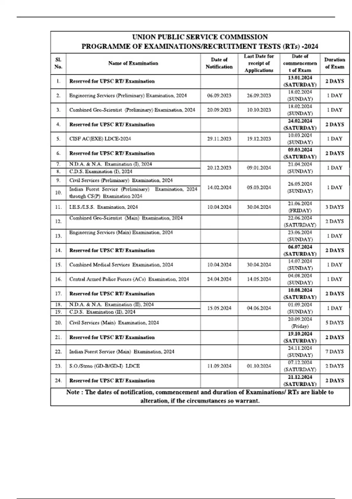 UPSC Exam Calendar- 2024