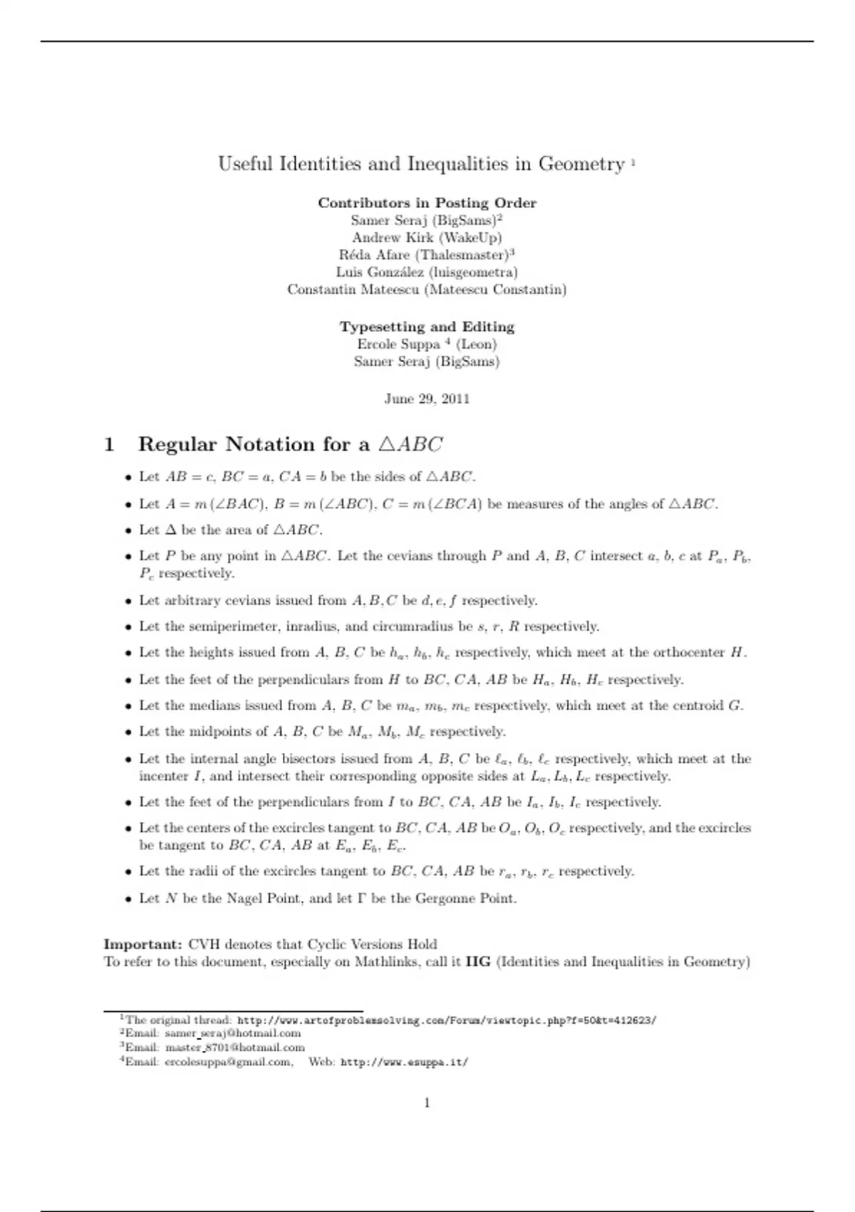 To refer to this document, especially on Mathlinks, call it IIG (Identities and Inequalities in Geometry)