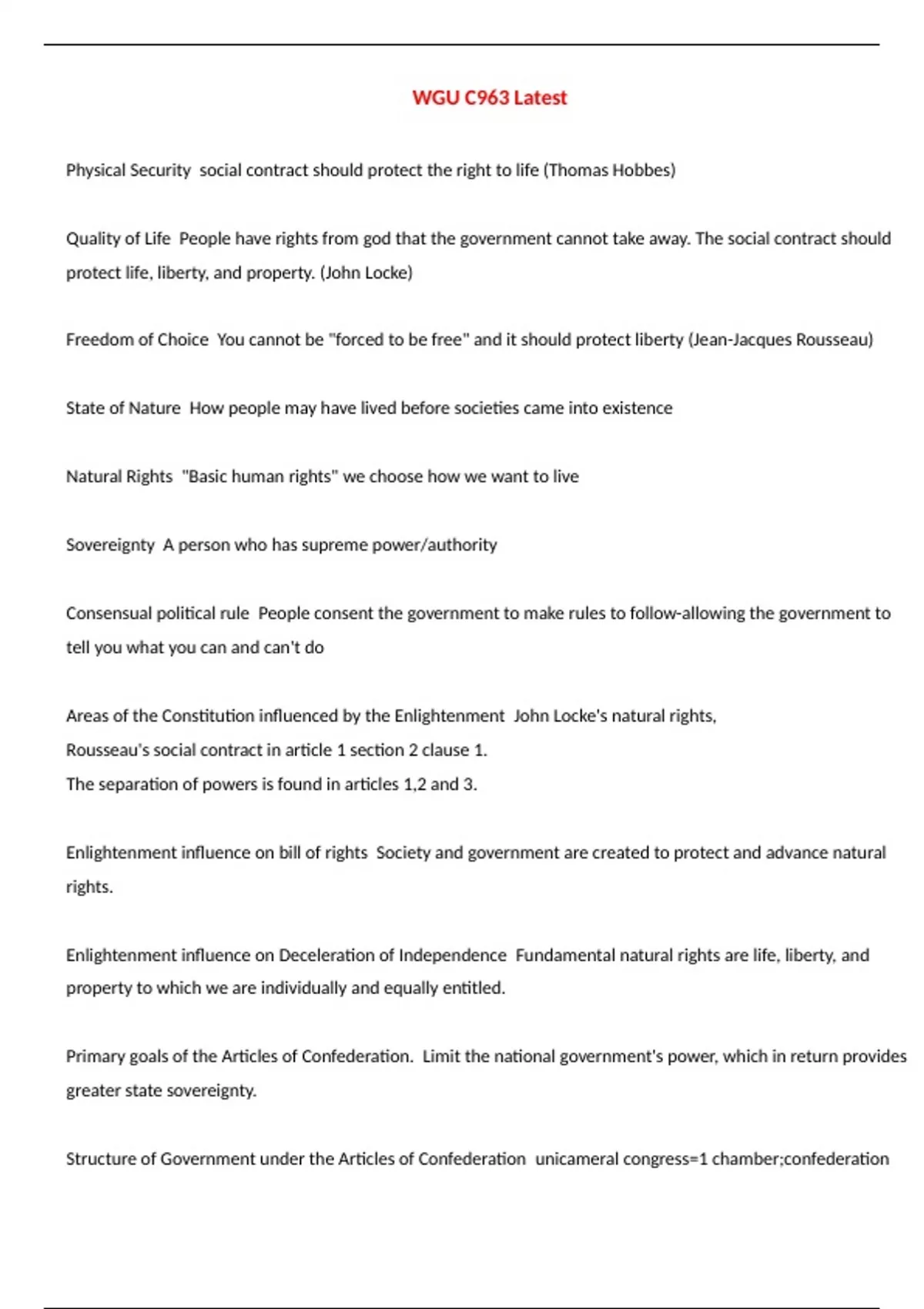 WGU C963 Latest Physical Security social contract should protect the right to life (Thomas Hobbes) Quality of Life People have rights from god that the government cannot take away. The social contract should protect life, liberty, and property. (John Locke) Freedom of Choice You cannot be "forced to be free" and it should protect liberty (Jean-Jacques Rousseau) State of Nature How people may have lived before societies came into existence Natural Rights "Basic human rights" we choose how we want to live Sovereignty A person who has supreme power/authority Consensual political rule People consent the government to make rules to follow-allowing the government to tell you what you can and can't do Areas of the Constitution influenced by the Enlightenment John Locke's natural rights, Rousseau's social contract in article 1 section 2 clause 1. The separation of powers is found in articles 1,2 and 3. Enlightenment influence on bill of rights Society and government are created to protect and advance natural rights. Enlightenment influence on Deceleration of Independence Fundamental natural rights are life, liberty, and property to which we are individually and equally entitled. Primary goals of the Articles of Confederation. Limit the national government's power, which in return provides greater state sovereignty.