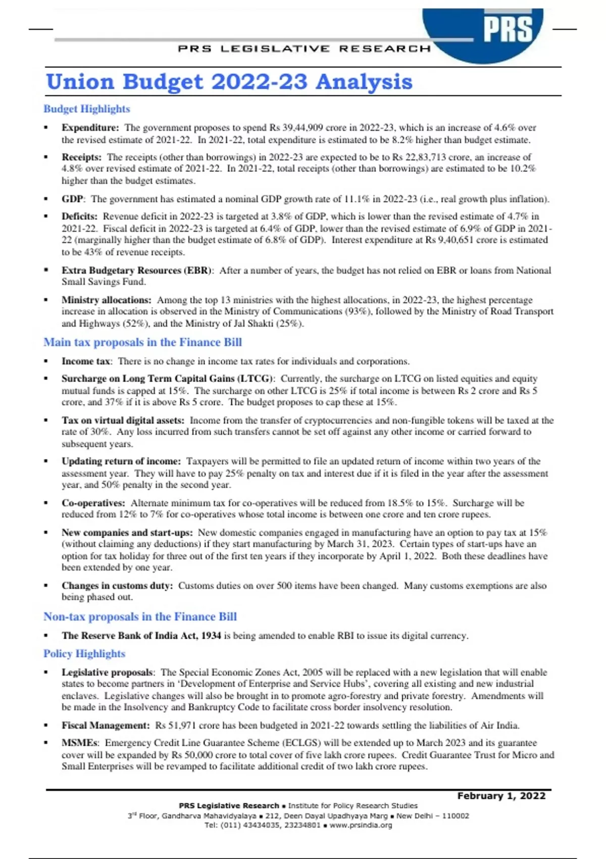, Union Budget 2022-23 Analysis PRS Legislative Research