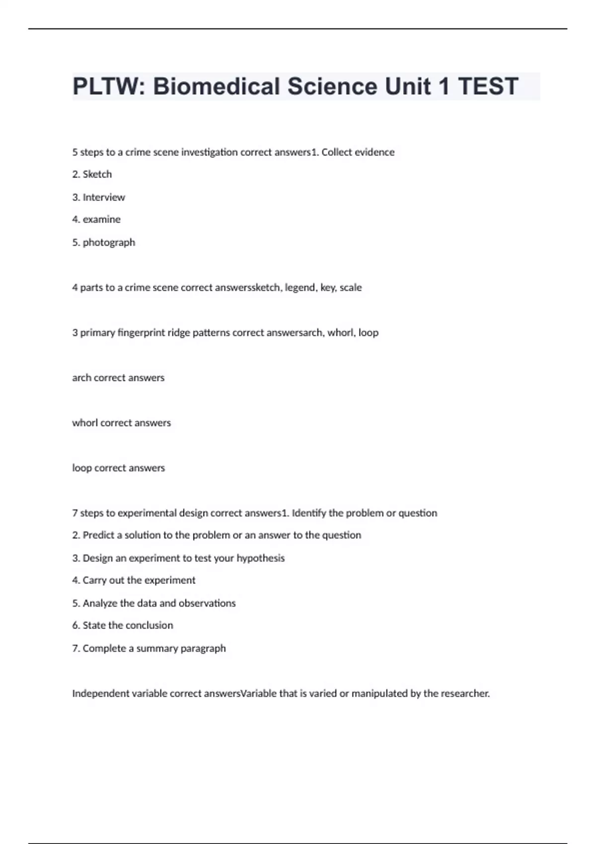 5 steps to a crime scene investigation correct answers1. Collect evidence 2. Sketch 3. Interview 4. examine 5. photograph 4 parts to a crime scene correct answerssketch, legend, key, scale 3 primary fingerprint ridge patterns correct answersarch, whorl, loop arch correct answers whorl correct answers loop correct answers 7 steps to experimental design correct answers1. Identify the problem or question 2. Predict a solution to the problem or an answer to the question 3. Design an experiment to test your hypothesis 4. Carry out the experiment 5. Analyze the data and observations 6. State the conclusion 7. Complete a summary paragraph Independent variable correct answersVariable that is varied or manipulated by the researcher.