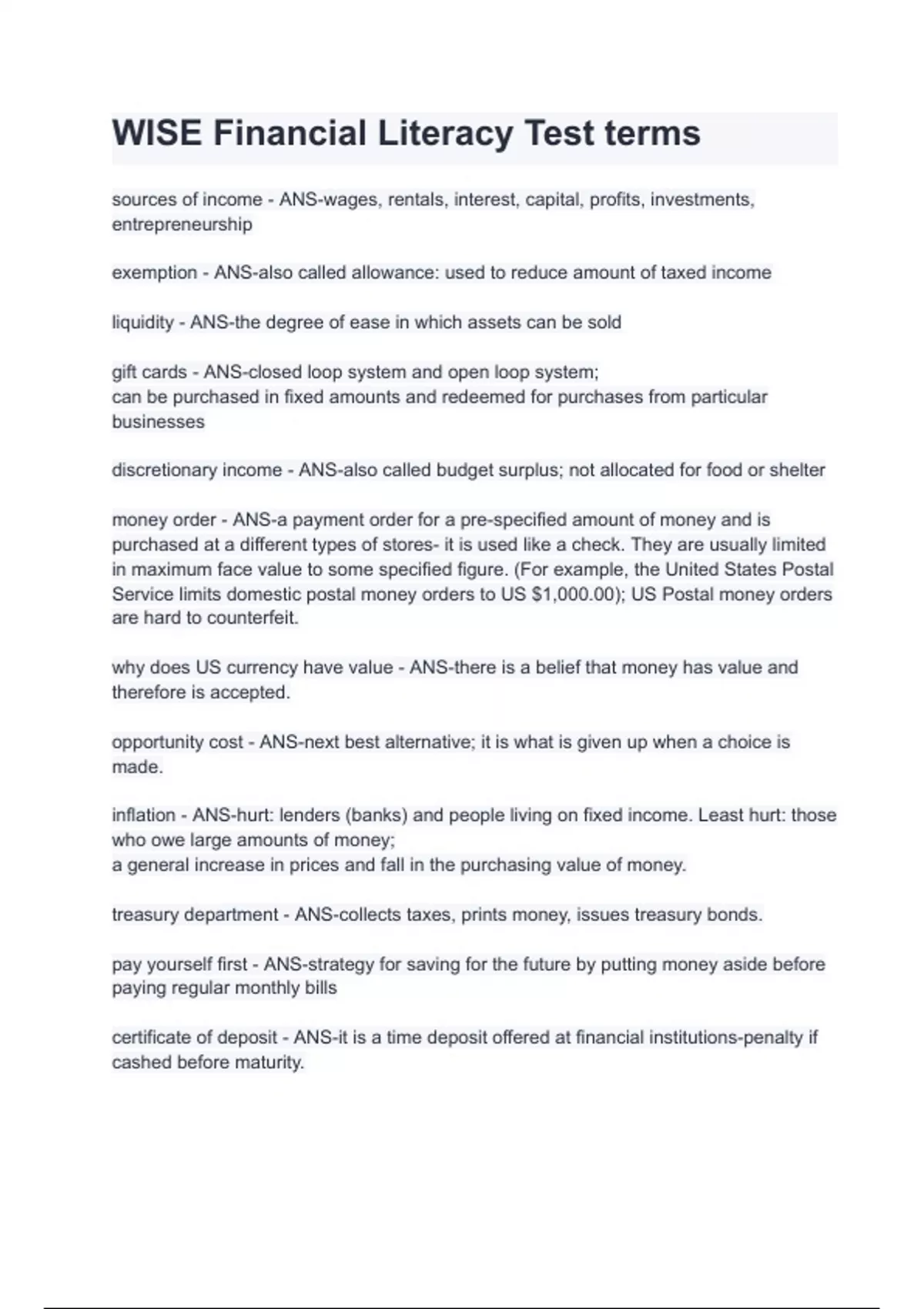 WISE Financial Literacy Test terms