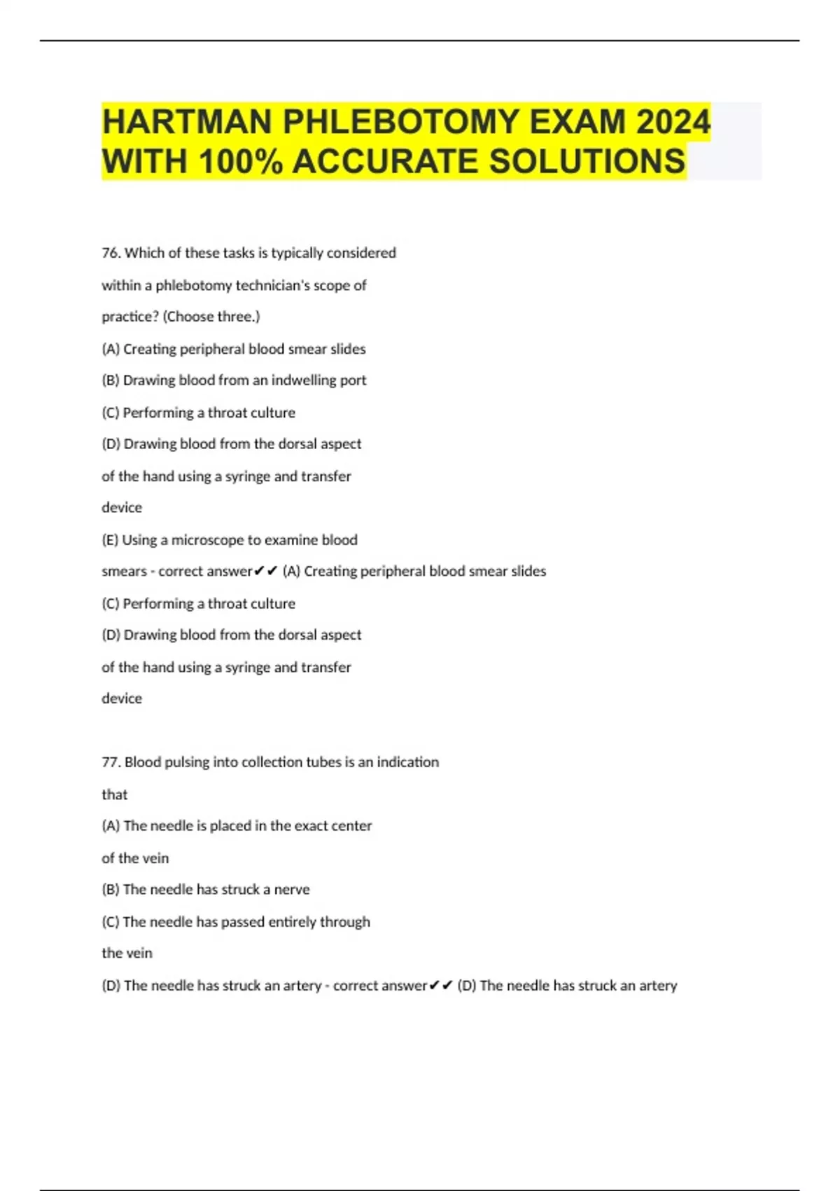 HARTMAN PHLEBOTOMY EXAM 2024 WITH 100% ACCURATE SOLUTIONS 76. Which of these tasks is typically considered within a phlebotomy technician's scope of practice? (Choose three.) (A) Creating peripheral blood smear slides (B) Drawing blood from an indwelling port (C) Performing a throat culture (D) Drawing blood from the dorsal aspect of the hand using a syringe and transfer device (E) Using a microscope to examine blood smears - correct answer (A) Creating peripheral blood smear slides (C) Performing a throat culture (D) Drawing blood from the dorsal aspect of the hand using a syringe and transfer device 77. Blood pulsing into collection tubes is an indication that (A) The needle is placed in the exact center of the vein