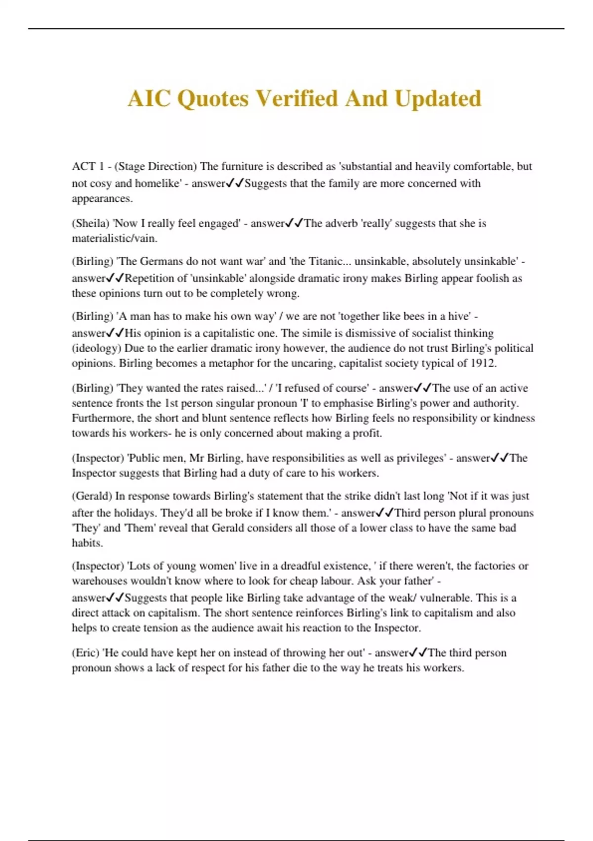 AIC Quotes Verified And Updated ACT 1 - (Stage Direction) The furniture is described as 'substantial and heavily comfortable, but not cosy and homelike' - answerSuggests that the family are more concerned with appearances. (Sheila) 'Now I really feel engaged' - answerThe adverb 'really' suggests that she is materialistic/vain. (Birling) 'The Germans do not want war' and 'the Titanic... unsinkable, absolutely unsinkable' - answerRepetition of 'unsinkable' alongside dramatic irony makes Birling appear foolish as these opinions turn out to be completely wrong. (Birling) 'A man has to make his own way' / we are not 'together like bees in a hive' - answerHis opinion is a capitalistic one. The simile is dismissive of socialist thinking (ideology) Due to the earlier dramatic irony however, the audience do not trust Birling's political opinions. Birling becomes a metaphor for the uncaring, capitalist society typical of 1912. (Birling) 'They wanted the rates raised...' / 'I refused of course' - answerThe use of an active sentence fronts the 1st person singular pronoun 'I' to emphasise Birling's power and authority. Furthermore, the short and blunt sentence reflects how Birling feels no responsibility or kindness towards his workers- he is only concerned about making a profit. (Inspector) 'Public men, Mr Birling, have responsibilities as well as privileges' - answerThe Inspector suggests that Birling had a duty of care to his workers. (Gerald) In response towards Birling's statement that the strike didn't last long 'Not if it was just after the holidays. They'd all be broke if I know them.' - answerThird person plural pronouns 'They' and 'Them' reveal that Gerald considers all those of a lower class to have the same bad habits. (Inspector) 'Lots of young women' live in a