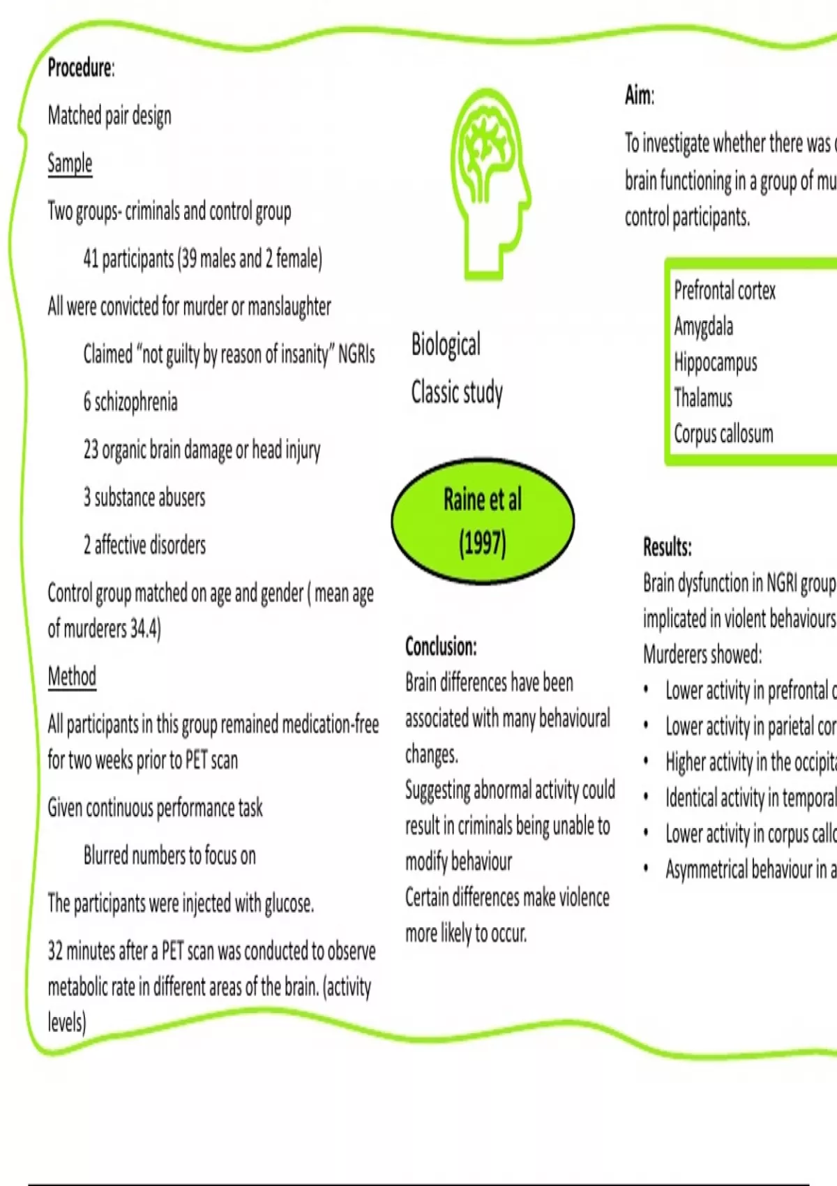 Mind maps of the aim, procedure, results/findings and conclusion of Edexcel biological psychology. Classic study of Raine and the contemporary study of Brendgen.