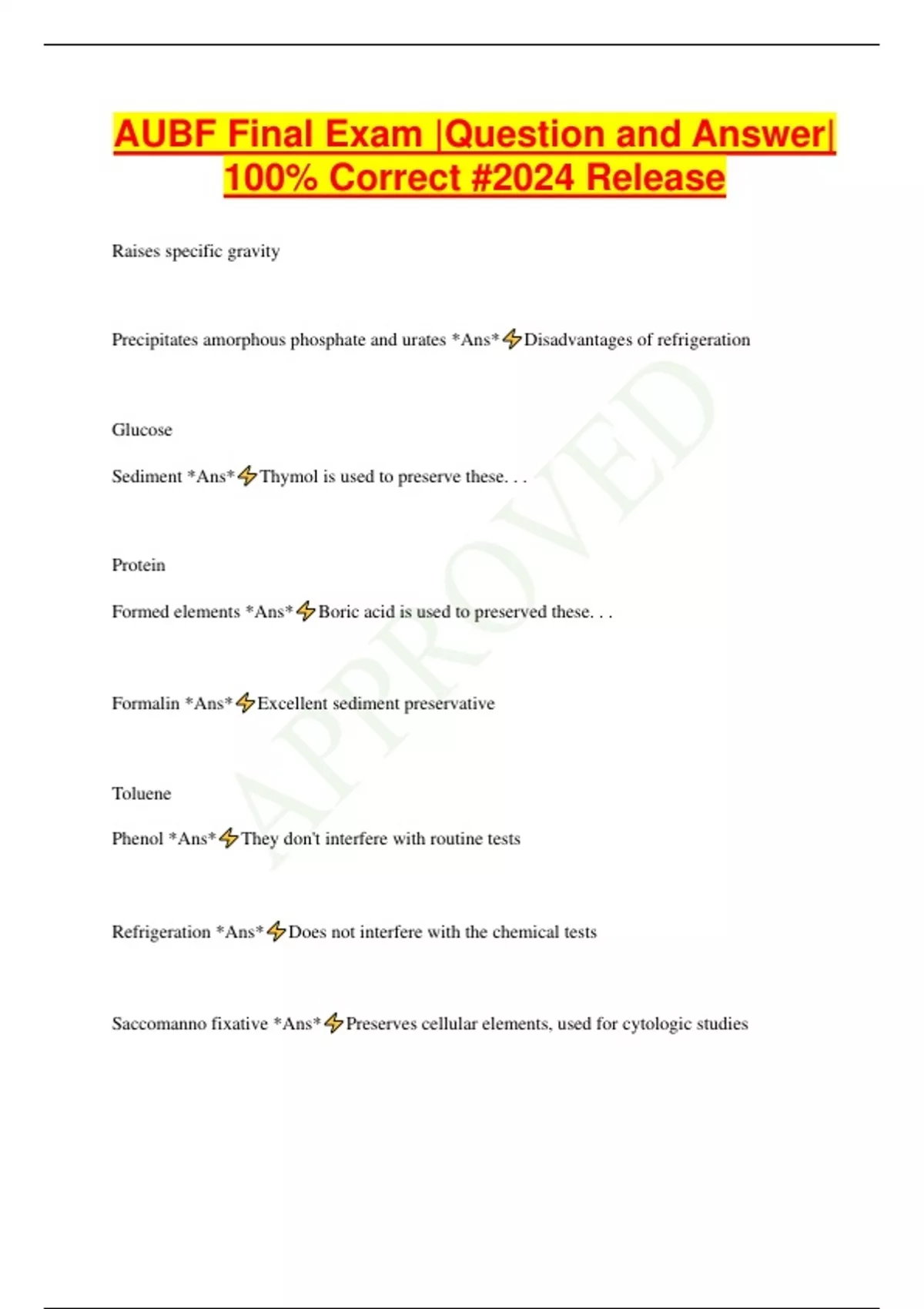 AUBF Final Exam |Question and Answer| 100% Correct #2024 Release Raises specific gravity Precipitates amorphous phosphate and urates *Ans* Disadvantages of refrigeration Glucose Sediment *Ans* Thymol is used to preserve these. . . Protein Formed elements *Ans* Boric acid is used to preserved these. . . Formalin *Ans* Excellent sediment preservative Toluene Phenol *Ans* They don't interfere with routine tests Refrigeration *Ans* Does not interfere with the chemical tests Saccomanno fixative *Ans* Preserves cellular elements, used for cytologic studies Causes an odor change *Ans* Disadvantage of phenol Na fluoride *Ans* Good preserve for DRUG ANALYSES Acid precipitation tests for protein *Ans* Thymol is false (+) with Copper reduction tests for glucose *Ans* Formalin is false (+) with Precipitates crystals *Ans* Disadvantage of boric acid Floats on surface of specimen *Ans* Disadvantage of toluene Inhibits reagent strip tests for glucose, blood and WBC *Ans* Disadvantage of Na fluoride Boric acid *Ans* Keeps pH at about 6.0 False (+) with copper reduction tests for glucose Clumping of sediments *Ans* Disadvantages