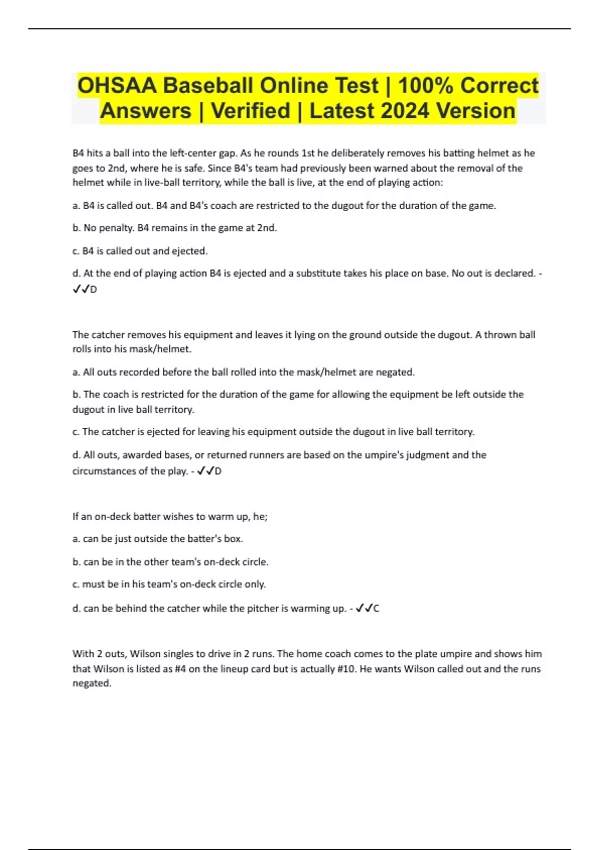 OHSAA Baseball Online Test | 100% Correct Answers | Verified | Latest 2024 Version