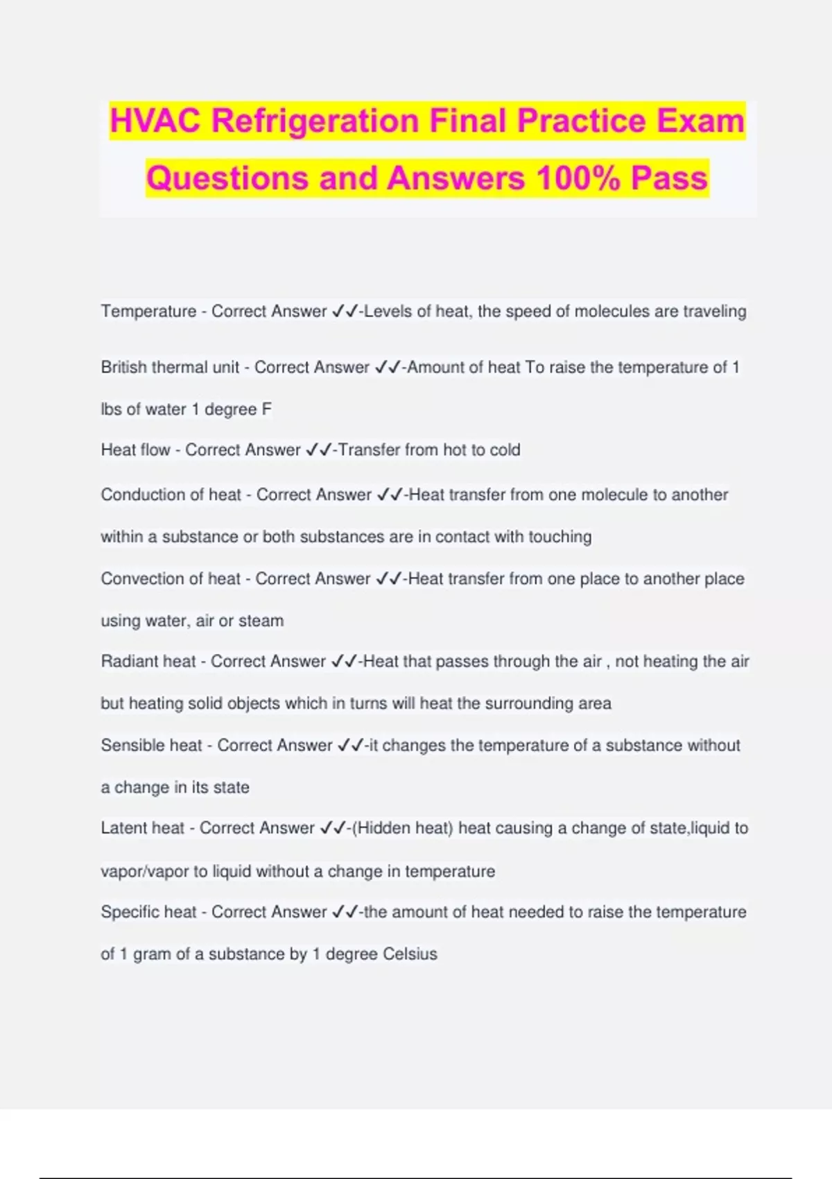 HVAC Refrigeration Final Practice Exam Questions and Answers 100% Pass Temperature - Correct Answer ️️ -Levels of heat, the speed of molecules are traveling British thermal unit - Correct Answer ️️ -Amount of heat To raise the temperature of 1 lbs of water 1 degree F Heat flow - Correct Answer ️️ -Transfer from hot to cold Conduction of heat - Correct Answer ️️ -Heat transfer from one molecule to another within a substance or both substances are in contact with touching Convection of heat - Correct Answer ️️ -Heat transfer from one place to another place using water, air or steam Radiant heat - Correct Answer ️️ -Heat that passes through the air , not heating the air but heating solid objects which in turns will heat the surrounding area Sensible heat - Correct Answer ️️ -it changes the temperature of a substance without a change in its state Latent heat - Correct Answer ️️ -(Hidden heat) heat causing a change of state,liquid to vapor/vapor to liquid without a change in temperature Specific heat - Correct Answer ️️ -the amount of heat needed to raise the temperature of 1 gram of a substance by 1 degree Celsius