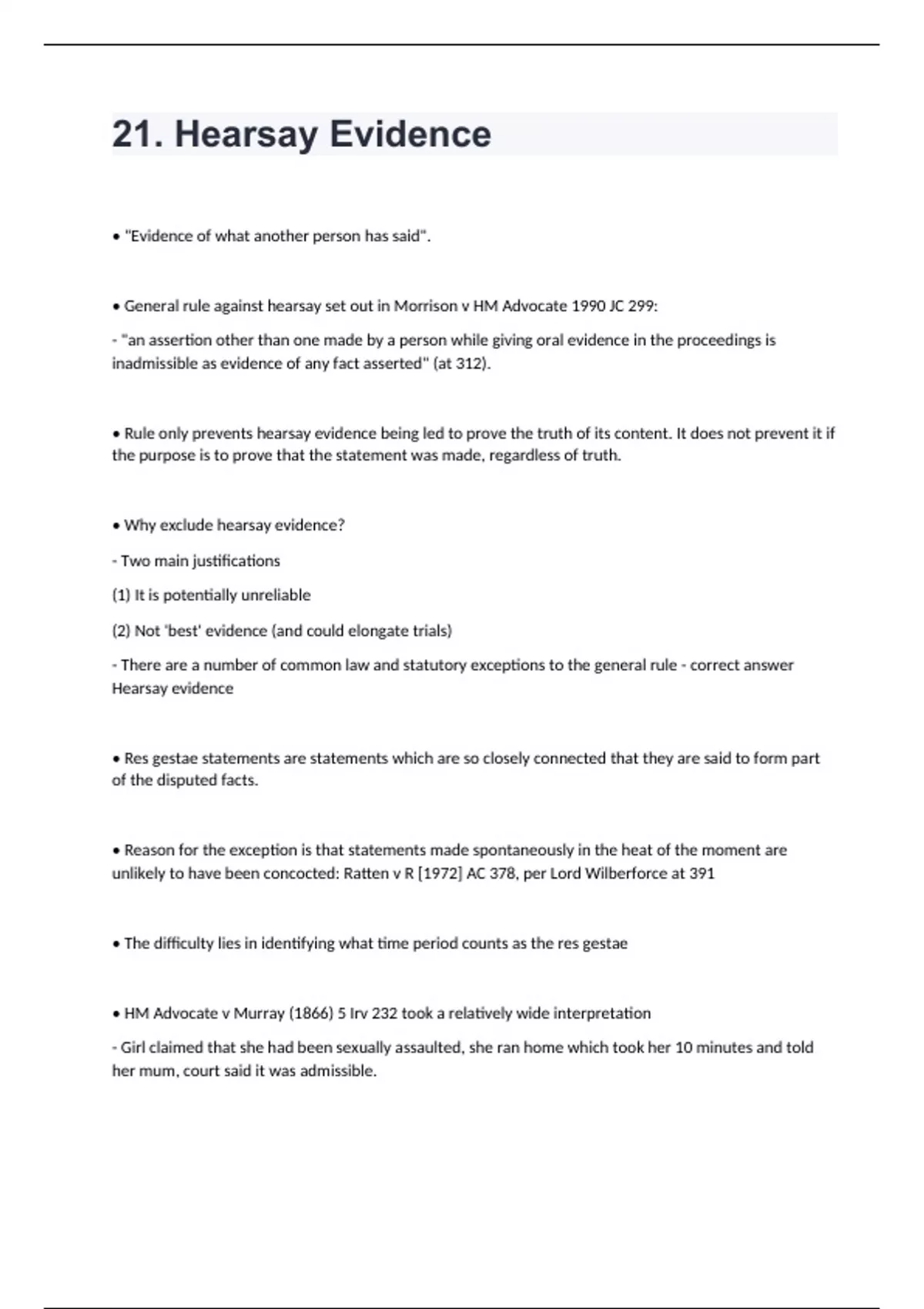 • "Evidence of what another person has said". • General rule against hearsay set out in Morrison v HM Advocate 1990 JC 299: - "an assertion other than one made by a person while giving oral evidence in the proceedings is inadmissible as evidence of any fact asserted" (at 312). • Rule only prevents hearsay evidence being led to prove the truth of its content. It does not prevent it if the purpose is to prove that the statement was made, regardless of truth. • Why exclude hearsay evidence? - Two main justifications (1) It is potentially unreliable (2) Not 'best' evidence (and could elongate trials) - There are a number of common law and statutory exceptions to the general rule - correct answer Hearsay evidence • Res gestae statements are statements which are so closely connected that they are said to form part of the disputed facts. • Reason for the exception is that statements made spontaneously in the heat of the moment are unlikely to have been concocted: Ratten v R [1972] AC 378, per Lord Wilberforce at 391 • The difficulty lies in identifying what time period counts as the res gestae • HM Advocate v Murray (1866) 5 Irv 232 took a relatively wide interpretation - Girl claimed that she had been sexually assaulted, she ran home which took her 10 minutes and told her mum, court said it was admissible. • Cinci v HM Advocate 2004 JC 103 took a far narrower view and this must now be regarded as the leading authority - Exchange students in the youth hostel. - Length of time accepted by the courts is now very narrow. • Can make distinction between res gestate and de recenti statements made shortly after the incident - correct answer (1) "Res gestae" statements • These (confessions or other incriminating admissions) are admissible as an exception to the hearsay rule on the bases that they are especially reliable. • Confessions are admissible as an exception to the hearsay rule because they are especially reliable • In the past there were special rules about the admissibility of mixed statements - those that are partly incriminating and partly exculpatory e.g. "I was there but it wasn't me who stabbed him" - McCutcheon v HM Advocate 2002 SLT 27 (Full Bench of nine judges!) • The Criminal Justice (Scotland) Act 2016 s.109 inserts s.261ZA into the 1995 Act which replaces complex rules with a simple rule: any statement made by accused in course of being questioned by police officers is admissible • (confirmed in McPhee v HM Advocate v HM Advocate [2019] HCJAC 8) - correct answer (2) Confessions • A witness can "adopt" a statement she made to police as her evidence in chief. This might be helpful if her memory of events has faded but she is confident she told the truth when she made the statement. • Follows Lord Coulsfield's recommendations made in Scottish Government's 2007 Review of the Law and Practice of Disclosure Report and also reflects Jamieson v HM Advocate 1994 J.C 251 • CPSA section 260(2): three conditions must be met: (a) the statement is contained in a document (but not a precognition i.e. statement taken by someone preparing the case for one of the parties, unless made on oath, because it would be considered partisan); (b) the witness in giving evidence indicates that he made the statement, and adopts it as his evidence; and (c) at the time it was made the maker would have been a competent witness. • See Croal v HM Advocate [2014] HCJAC 34 - correct answer (3) Adoption of prior statements • Under section 259(2) of the CPSA, hearsay evidence is admissible where the person who made the statement: (a) is dead, or is, by reason of his bodily or mental condition, unfit or unable to give evidence in any competent manner; (b) is named and otherwise sufficiently identified, but is outwith the UK, and it is not reasonably practicable to secure his attendance at the trial or to obtain his evidence in any other competent manner; (c) is named and otherwise sufficiently identified, but cannot be found (all reasonable steps having been taken); (d) has refused to give evidence (with the court's permission) on the basis that it might incriminate him (because the court needs all the evidence to determine the guilt or innocence of the accused); (e) has either refused to take the oath or has refused to give evidence. The witness must be in court and must have refused to take the oath or answer questions after specifical - correct answer (4) The statutory exceptions • In HM Advocate v Malloy [2012] HCJ 124 court made it clear that the statutory rules replace the previous common law - Didn't make the application therefore the evidence was inadmissible, court made it clear that the statutory rules replace the common law. • Where a party wishes to lead hearsay evidence under gateway (a) (b) or (c) he or she must make an application to the court in writing in advance: section 259(5) - correct answer (4) The statutory exceptions: interpretation • In Lees v HM Advocate [2016] HCJAC 16 the court confirmed that evidence admitted from a deceased person under s.259(2)(a) had the same value as spoken evidence & could offer corroboration by way of the Moorov doctrine • Meaning of incompetent, see HM Advocate v Patterson 2000 J.C 137, the court rejected alcoholism as rendering a witness incompetent under 259(2)(a) - correct answer (4) The statutory exceptions: interpretation (s.259(2)(A)) • In Aslam v HM Advocate 2000 J.C 325 the court upheld the decision by the Sheriff not to allow hearsay evidence after not being satisfied that the witness was abroad, as claimed. - correct answer (4) The statutory exceptions: interpretation (s.259(2)(B)) • In Macdonald v HM Advocate 1999 SLT 533 the court held that part (e) (the exception for a witness who refuses to take the oath or give evidence) is to be interpreted strictly - Court held that part (e) is to be interpreted strictly. - Young child giving evidence about a sexual assault but broke down in court and was too distress
