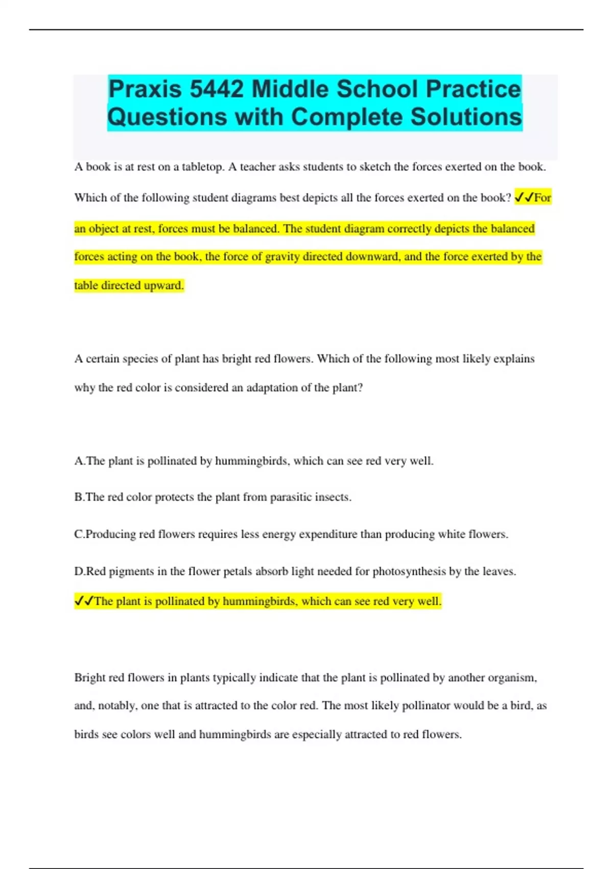 Praxis 5442 Middle School Practice Questions with Complete Solutions A book is at rest on a tabletop. A teacher asks students to sketch the forces exerted on the book. Which of the following student diagrams best depicts all the forces exerted on the book? For an object at rest, forces must be balanced. The student diagram correctly depicts the balanced forces acting on the book, the force of gravity directed downward, and the force exerted by the table directed upward. A certain species of plant has bright red flowers. Which of the following most likely explains why the red color is considered an adaptation of the plant? A.The plant is pollinated by hummingbirds, which can see red very well. B.The red color protects the plant from parasitic insects. C.Producing red flowers requires less energy expenditure than producing white flowers. D.Red pigments in the flower petals absorb light needed for photosynthesis by the leaves. The plant is pollinated by hummingbirds, which can see red very well. Bright red flowers in plants typically indicate that the plant is pollinated by another organism, and, notably, one that is attracted to the color red. The most likely pollinator would be a bird, as birds see colors well and hummingbirds are especially attracted to red flowers. A child at the top of a slide has gravitational potential energy equal to EE . If air resistance and friction are negligible, which of the following is true about the potential energy and the kinetic energy of the child just as the child reaches the bottom of the slide? Potential Energy. Kinetic Energy A. 0 0 B. 1/2E 1/2 E C. E 0 D. 0 E 0 E All the gravitational potential energy will be converted into kinetic energy if there are no frictional forces acting on the system. A drop of water containing green plant cells and a type of bacterium that is attracted to oxygen is placed on a glass slide, and the drop is sealed with a coverslip having grease around the edges. When the slide is illuminated, a process will occur in which of the following plant cell structures that will cause the bacteria to move toward the plant cells? A.Nucleus B.Central vacuole C.Chloroplast D.Mitochondrion Chloroplast The plant cell organelles that perform photosynthesis are the chloroplasts. If the plant cells are illuminated, photosynthesis will occur in the chloroplasts and oxygen will be produced. The bacteria will move toward the oxygen source—the green plant cells. A group of students measured the boiling point of three different samples of pure water. Each measurement was made by a different student using the same thermometer. Their measurements were 94°C, 99°C, and 104°C. Which of the following