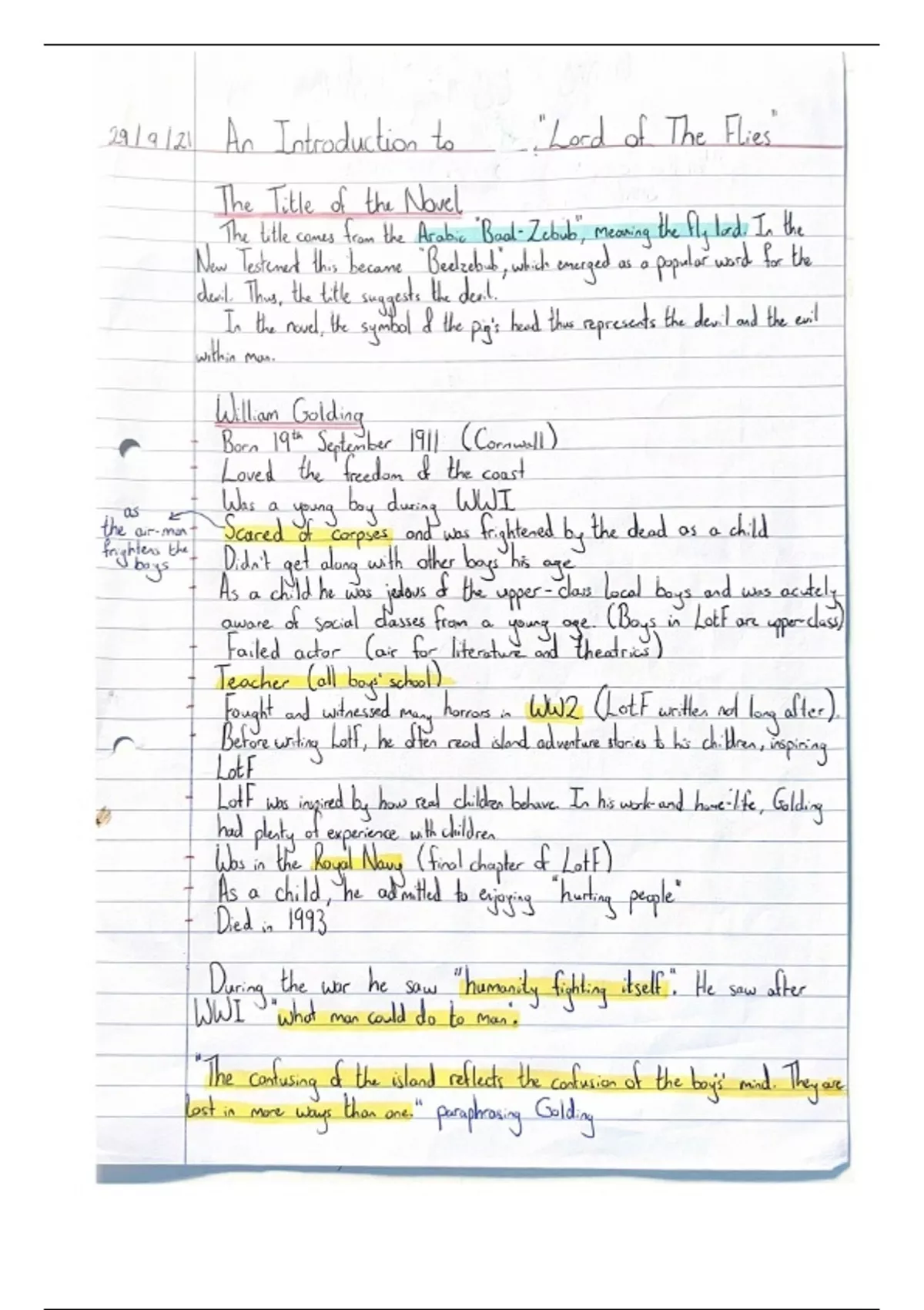Extensive notes on context and characters for William Golding’s “Lord of the Flies”. Using these notes, I got an A* in English Literature. Happy studying!