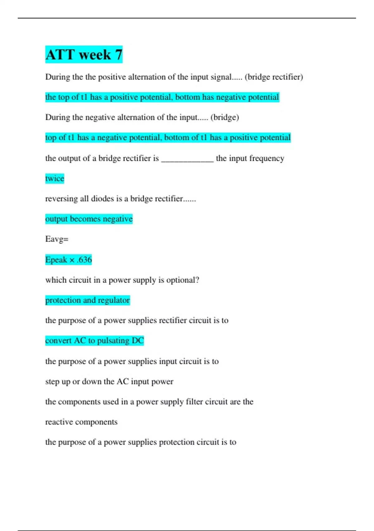 ATT week 7 During the the positive alternation of the input signal..... (bridge rectifier) the top of t1 has a positive potential, bottom has negative potential During the negative alternation of the input..... (bridge) top of t1 has a negative potential, bottom of t1 has a positive potential the output of a bridge rectifier is ____________ the input frequency