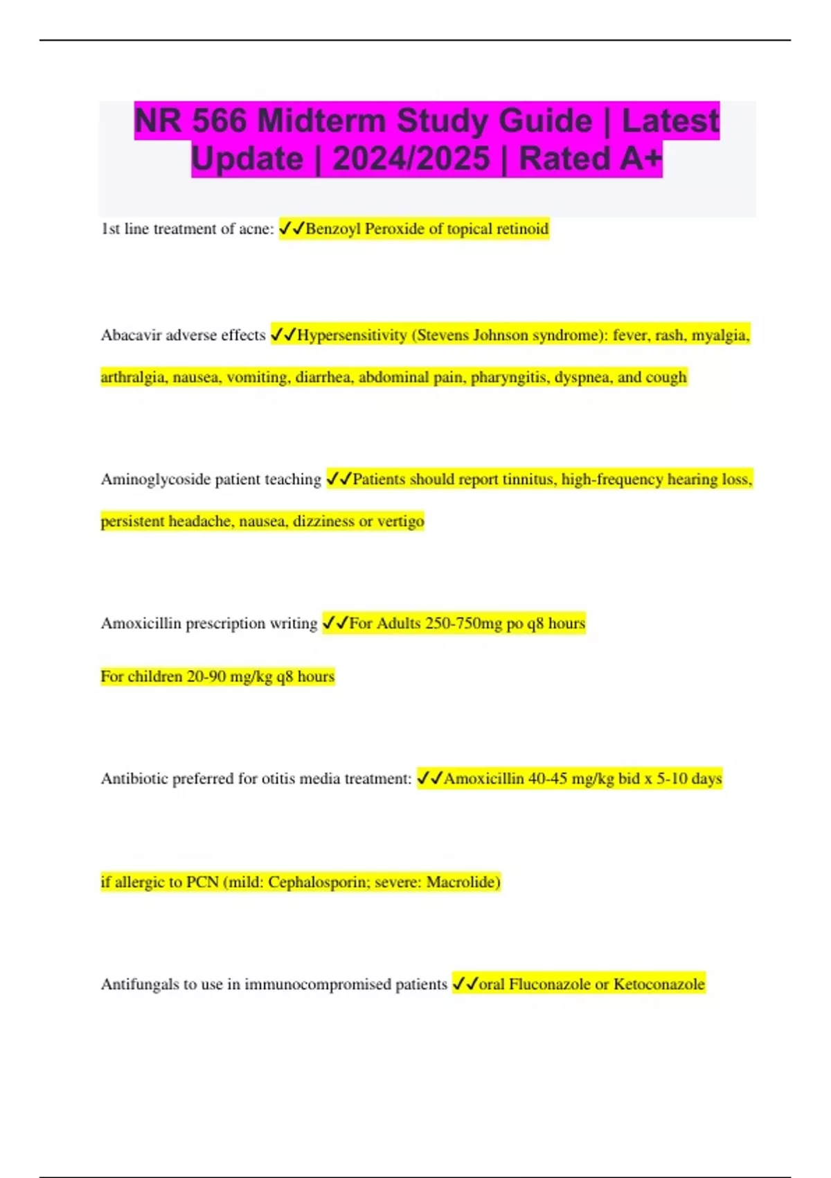 NR 566 Midterm Study Guide | Latest Update | 2024/2025 | Rated A+ 1st line treatment of acne: Benzoyl Peroxide of topical retinoid Abacavir adverse effects Hypersensitivity (Stevens Johnson syndrome): fever, rash, myalgia, arthralgia, nausea, vomiting, diarrhea, abdominal pain, pharyngitis, dyspnea, and cough Aminoglycoside patient teaching Patients should report tinnitus, high-frequency hearing loss, persistent headache, nausea, dizziness or vertigo Amoxicillin prescription writing For Adults 250-750mg po q8 hours For children 20-90 mg/kg q8 hours Antibiotic preferred for otitis media treatment: Amoxicillin 40-45 mg/kg bid x 5-10 days if allergic to PCN (mild: Cephalosporin; severe: Macrolide) Antifungals to use in immunocompromised patients oral Fluconazole or Ketoconazole Avoid Amphotericin B At what BMI level should bariatric surgery be considered? Greater than 35 baseline data needed for Phentermine? Thorough cardiac assessment Benzoyl peroxide prescription writing: concentrations range from 2.5% - 10%. For initial therapy once daily application is recommended. Over time, the frequency can be increased to three times a day. CAP first line treatment Macrolides, Doxycyline, Amoxicillin CAP treatment during pregnancy Amoxicillin, cephalosporins, or Erythromycin Cephalosporins in pregnancy All appear safe for use cerumen impaction cause packing wax into ear through use of q-tips and other cleaning devices cerumen impaction treatment can be removed by irrigation w/ warm water/saline or OTC Debrox ear drops to soften for removal or suction Common CAP pathogens S. Pneumoniae (most common) H. Influenzae (smokers/COPD) P. Aeruginosa (CF) Drug class known for ALL drugs in class to promote development