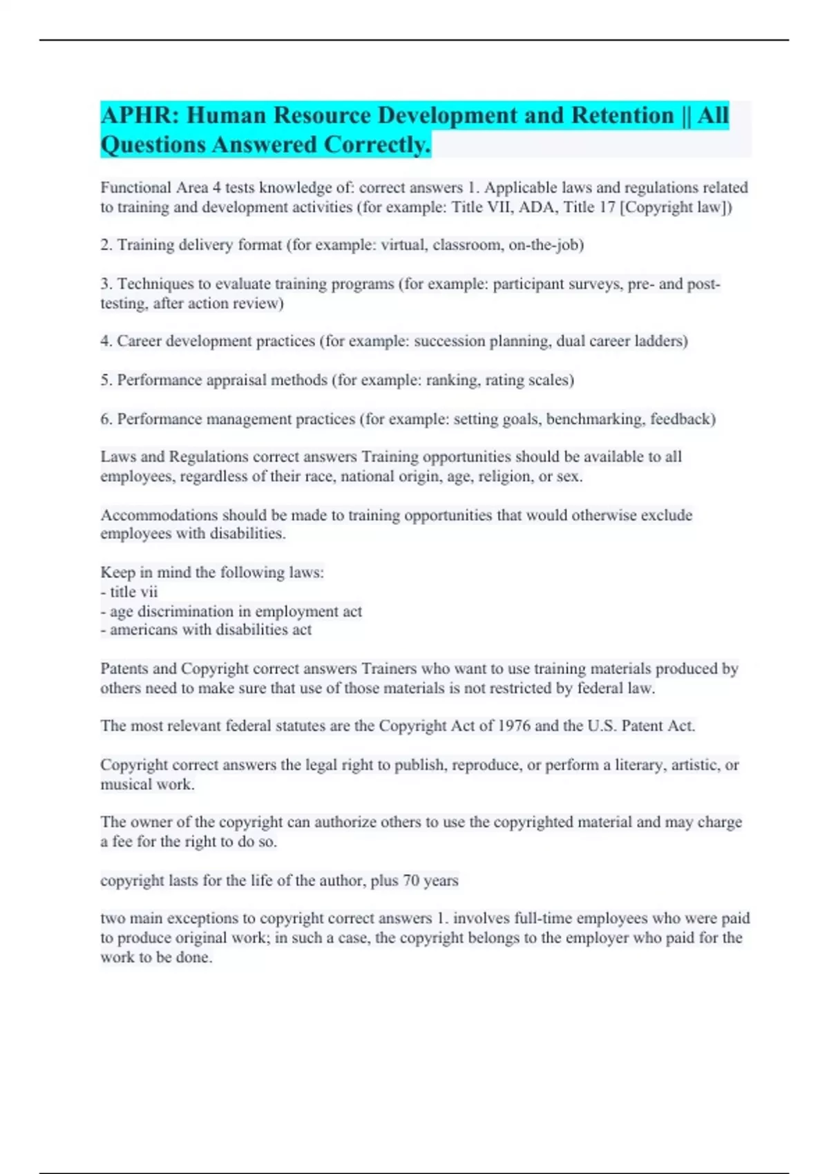 Functional Area 4 tests knowledge of: correct answers 1. Applicable laws and regulations related to training and development activities (for example: Title VII, ADA, Title 17 [Copyright law]) 2. Training delivery format (for example: virtual, classroom, on-the-job) 3. Techniques to evaluate training programs (for example: participant surveys, pre- and post-testing, after action review) 4. Career development practices (for example: succession planning, dual career ladders) 5. Performance appraisal methods (for example: ranking, rating scales) 6. Performance management practices (for example: setting goals, benchmarking, feedback) Laws and Regulations correct answers Training opportunities should be available to all employees, regardless of their race, national origin, age, religion, or sex. Accommodations should be made to training opportunities that would otherwise exclude employees with disabilities. Keep in mind the following laws: - title vii - age discrimination in employment act - americans with disabilities act Patents and Copyright correct answers Trainers who want to use training materials produced by others need to make sure that use of those materials is not restricted by federal law. The most relevant federal statutes are the Copyright Act of 1976 and the U.S. Patent Act. Copyright correct answers the legal right to publish, reproduce, or perform a literary, artistic, or musical work. The owner of the copyright can authorize others to use the copyrighted material and may charge a fee for the right to do so. copyright lasts for the life of the author, plus 70 years two main exceptions to copyright correct answers 1. involves full-time employees who were paid to produce original work; in such a case, the copyright belongs to the employer who paid for the work to be done.