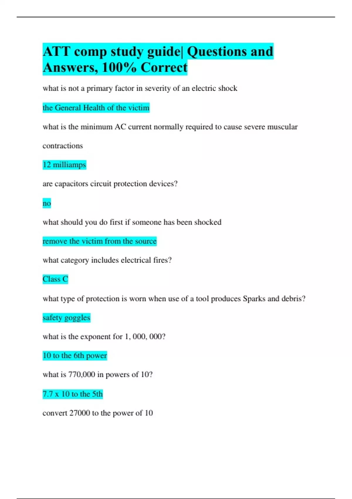 ATT comp study guide| Questions and Answers, 100% Correct what is not a primary factor in severity of an electric shock the General Health of the victim what is the minimum AC current normally required to cause severe muscular contractions 12 milliamps are capacitors circuit protection devices? no what should you do first if someone has been shocked remove the victim from the source what category includes electrical fires? Class C what type of protection is worn when use of a tool produces Sparks and debris? safety goggles what is the exponent for 1, 000, 000? 10 to the 6th power what is 770,000 in powers of 10? 7.7 x 10 to the 5th convert 27000 to the power of 10 2.7 * 10 to the 4th convert 0.00003 to the power of 1