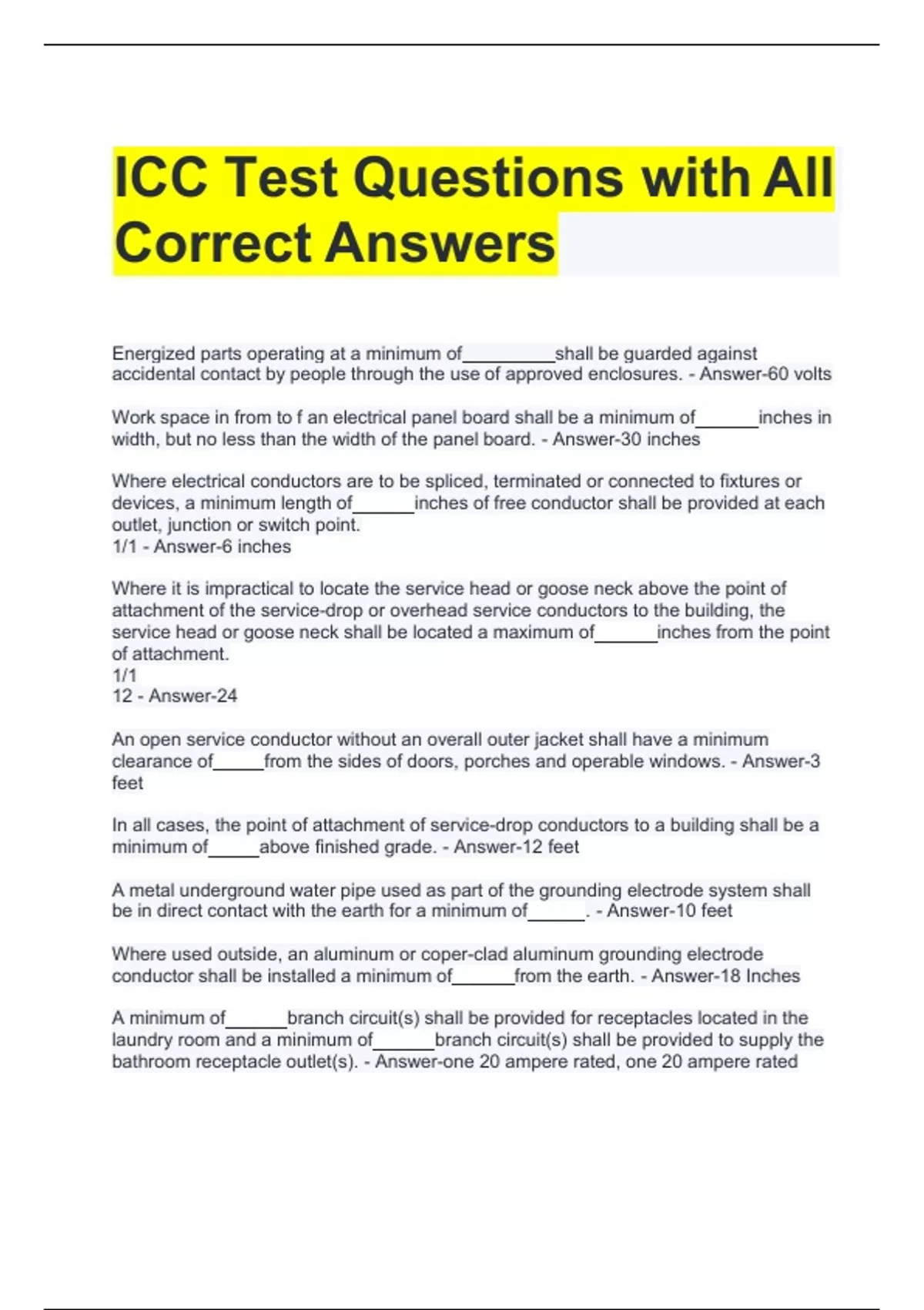 ICC Test Questions with All Correct A Work space in from to f an electrical panel board shall be a minimum of inches in width, but no less than the width of the panel board. - Answer-30 inches Where electrical conductors are to be spliced, terminated or connected to fixtures or devices, a minimum length of inches of free conductor shall be provided at each outlet, junction or switch point. 1/1 - Answer-6 inches Where it is impractical to locate the service head or goose neck above the point of attachment of the service-drop or overhead service conductors to the building, the service head or goose neck shall be located a maximum of inches from the point of attachment. 1/1 12 - Answer-24 An open service conductor without an overall outer jacket shall have a minimum clearance of from the sides of doors, porches and operable windows. - Answer-3 feet In all cases, the point of attachment of service-drop conductors to a building shall be a minimum of above finished grade. - Answer-12 feet A metal underground water pipe used as part of the grounding electrode system shall be in direct contact with the earth for a minimum of . - Answer-10 feet Where used outside, an aluminum or coper-clad aluminum grounding electrode conductor shall be installed a minimum of from the earth. - Answer-18 Inches A minimum of branch circuit(s) shall be provided for receptacles located in the laundry room and a minimum of branch circuit(s) shall be provided to supply the bathroom receptacle outlet(s). - Answer-one 20 ampere rated, one 20 ampere rated In the calculation of electrical feeder loads, an electric clothes dryer load shall be considered VA for each dryer circuit or the nameplate load of each dryer, whichever is greater. - Answer-5000 What is the maximum over current-protection-device rating permitted for No. 12 copper conductors? - Answer-20 amps Electrical panel boards and over current protection devices shall not be located in: - Answer-Clothes closets Where metallic plugs or plates are used with nonmetallic electrical enclosures to close unused openings, they shall be recessed a minimum of inches from the outer surface of the enclosure. - Answer-1/4 Electrical service disconnecting means shall not be installed in . - Answer- Bathroom Electrical conductors located above a roof shall be installed with a minimum vertical clearance of feet where the roof has a slope of 8:12. - Answer-3 Service-entrance cables shall be supported by straps or other approved means within inches - Answer-12,30 Type NM wiring shall be supported a maximum of on center. - Answer-41/2 feet In general, direct burial cable installed below a driveway serving a one-family dwelling unit shall hava a minimum burial depth of . - Answer-18 Inches Direct buried conductors and cables emerging from the ground shall be protected by enclosures or raceways extending to a minimum height of above finished grade or the point of entrance to the building. - Answer-8 Feet At a kitchen counter, counter top receptacle outlets shall be installed with a maximum horizontal distance of from any point along the wall line to an outlet. - Answer- 24 Inches In a bathroom, at least one receptacle outlet shall be located a maximum of from the outside edge of each lavatory. - Answer-36 Inches All 125-volt, single-phase, 20-ampere receptacle shall be provided with ground-fault circuit-interrupter protection where located within of the outside edge of a laundry sink. - Answer-6 Feet Where nonmetallic-sheathed cable is used, the cable assembly including the sheath shall extend into the box a minimum of through a nonmetallic-sheathed cable knockout opening. - Answer-1/4 inch What is the required receptacle rating for a 20-ampere branch circuit supplying two or more receptacles or outlets? - Answer-15 amperes or 20 amperes threshold. - Answer-3 feet, 8 feet At least one 125-volt receptacle shall be located a minimum of from the inside walls of indoor spas and hot tubs. - Answer-6 Feet Where three or more conductors of minimum size AWG are run at angles with joists in unfinished basements, additional protection is not required if the cable assembly is attached directly to the bottom of the joists. - Answer-8 Lighting track shall be located a minimum of above the finished floor unless protected from physical damage or the track operates at less than 30 volts rms open- circuit voltage. - Answer-5 feet, 0 inches The receptacle outlet required in a bathroom, where located on the side of the basin cabinet, shall be located a maximum of inches below the top of the basin. - Answer-12 Inches