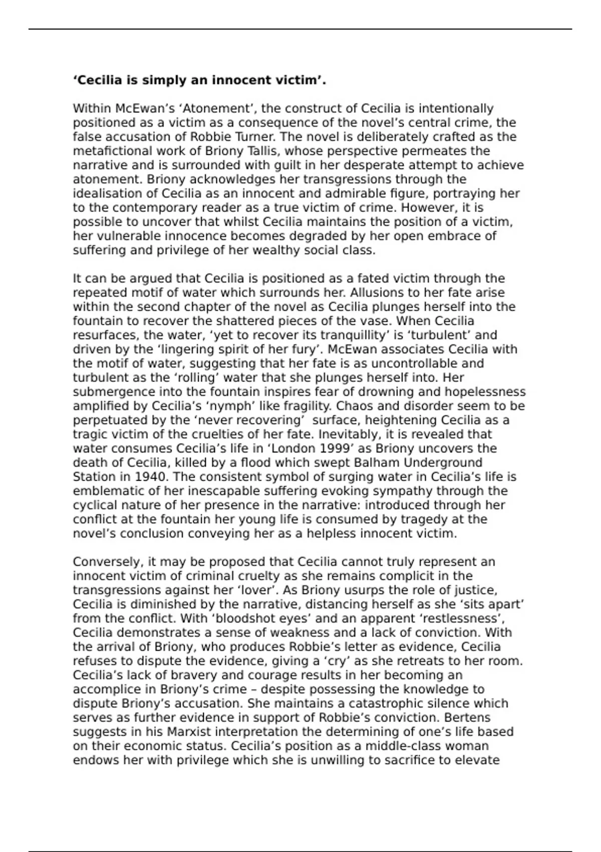 Within McEwan’s ‘Atonement’, the construct of Cecilia is intentionally