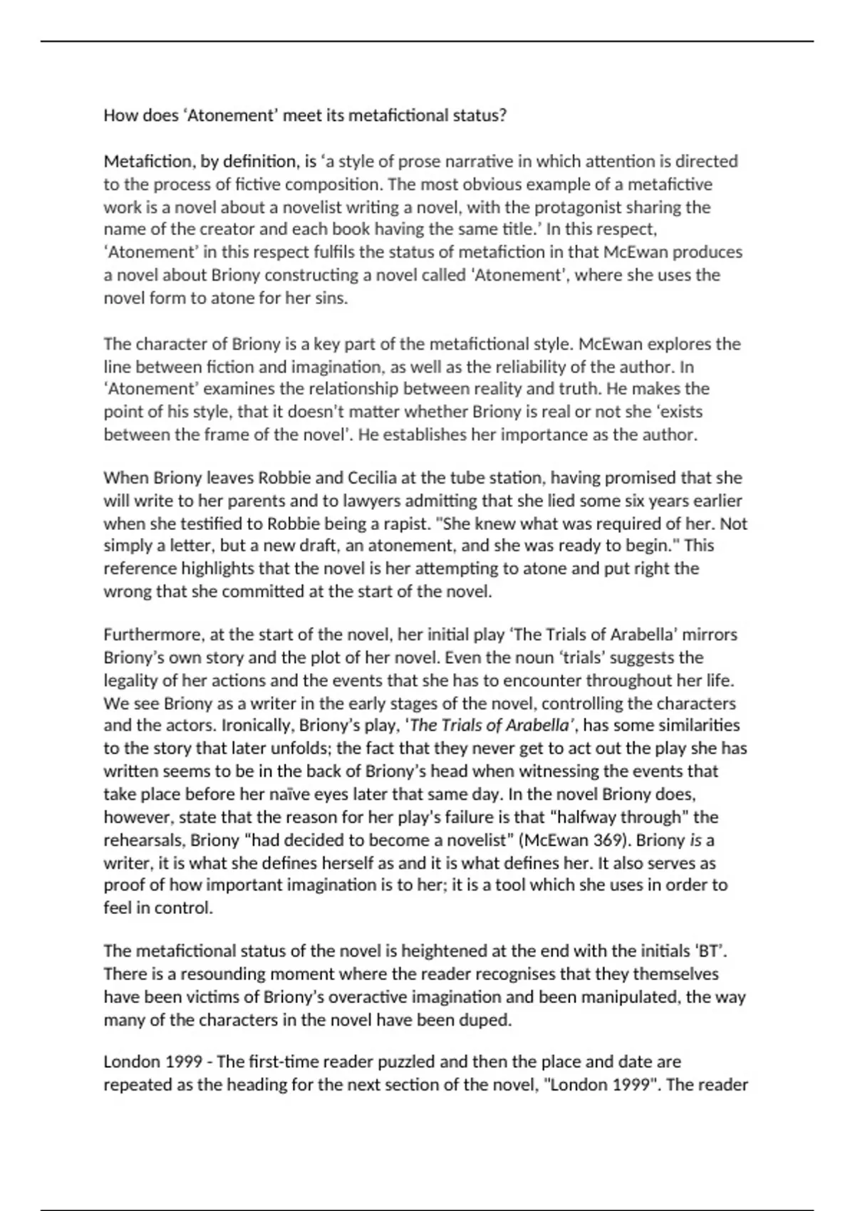‘Atonement’ in this respect fulfils the status of metafiction in that McEwan produces