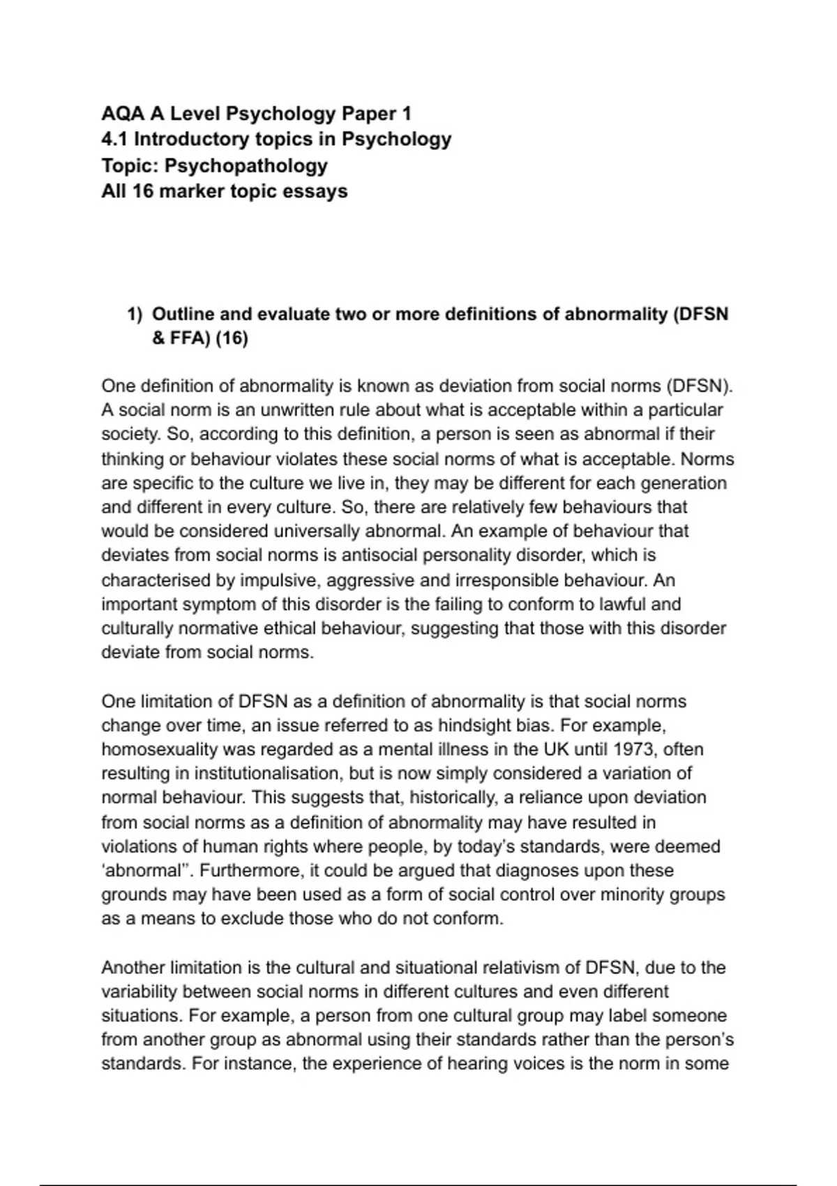 1) Outline and evaluate two or more definitions of abnormality (DFSN