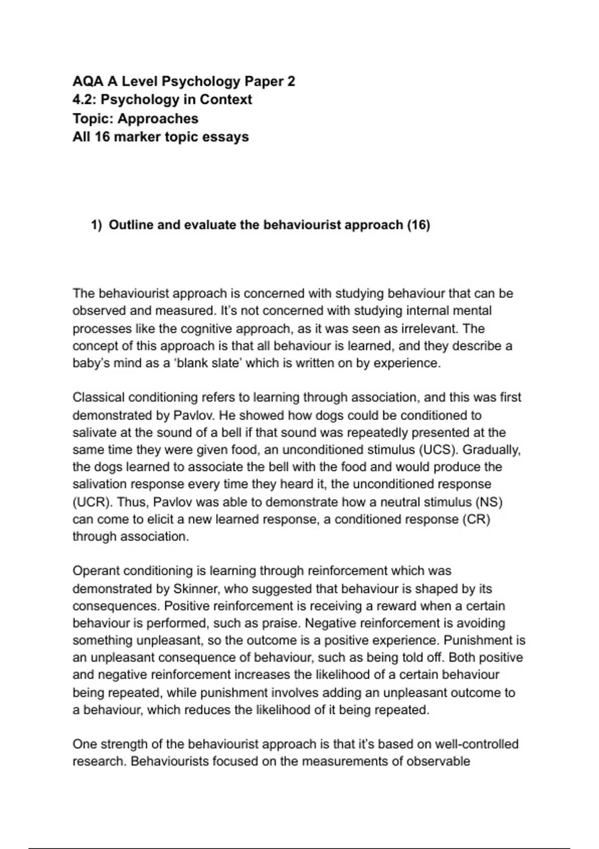 This document contains all the possible Approaches 16 marker essays that could come up on your Psychology Paper 1 exam for the AQA examboard. It can also be used for shorter answers, or just some general revision for the topic. Great for AO3, as it also contains counter criticisms and issues and debates evaluations which helps boost your marks for AO3!