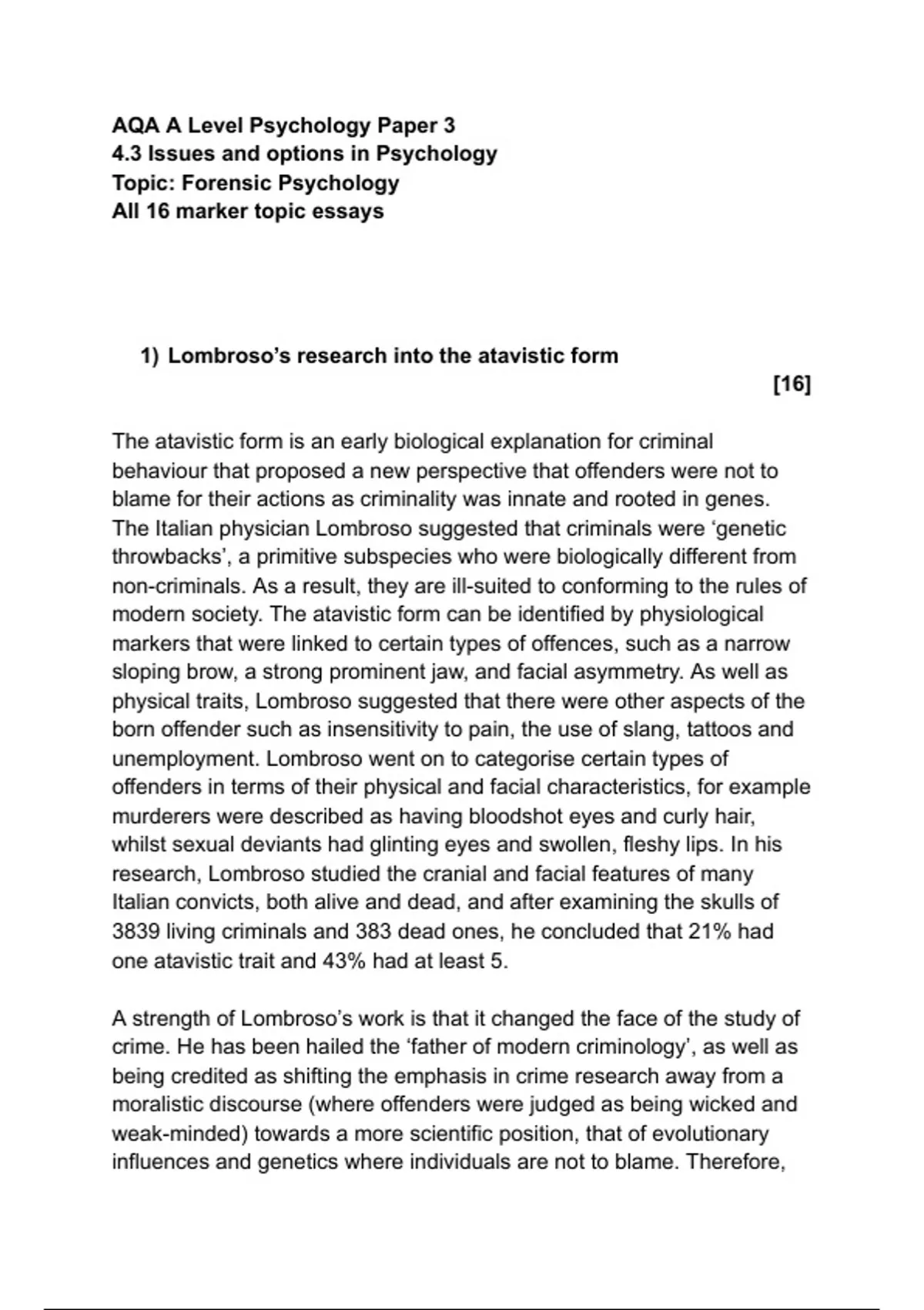 This document contains all the possible Forensic Psychology 16 marker essays that could come up on your Psychology Paper 3 exam for the AQA examboard. It can also be used for shorter answers, or just some general revision for the topic. Great for AO3, as it also contains counter criticisms and issues and debates evaluations which helps boost your marks for AO3!