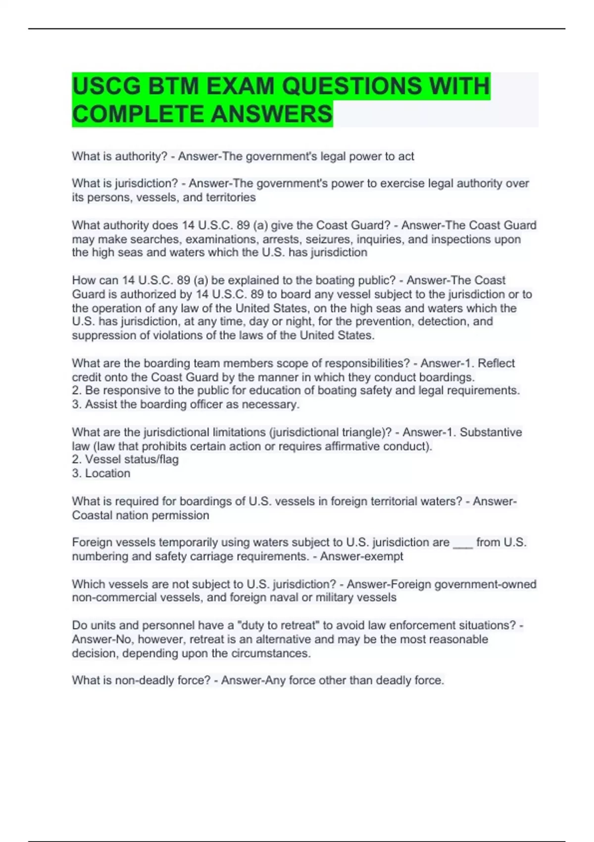 What is authority? - Answer-The government's legal power to act What is jurisdiction? - Answer-The government's power to exercise legal authority over its persons, vessels, and territories What authority does 14 U.S.C. 89 (a) give the Coast Guard? - Answer-The Coast Guard may make searches, examinations, arrests, seizures, inquiries, and inspections upon the high seas and waters which the U.S. has jurisdiction How can 14 U.S.C. 89 (a) be explained to the boating public? - Answer-The Coast Guard is authorized by 14 U.S.C. 89 to board any vessel subject to the jurisdiction or to the operation of any law of the United States, on the high seas and waters which the U.S. has jurisdiction, at any time, day or night, for the prevention, detection, and suppression of violations of the laws of the United States. What are the boarding team members scope of responsibilities? - Answer-1. Reflect credit onto the Coast Guard by the manner in which they conduct boardings. 2. Be responsive to the public for education of boating safety and legal requirements. 3. Assist the boarding officer as necessary. What are the jurisdictional limitations (jurisdictional triangle)? - Answer-1. Substantive law (law that prohibits certain action or requires affirmative conduct). 2. Vessel status/flag 3. Location What is required for boardings of U.S. vessels in foreign territorial waters? - Answer-Coastal nation permission Foreign vessels temporarily using waters subject to U.S. jurisdiction are ___ from U.S. numbering and safety carriage requirements. - Answer-exempt Which vessels are not subject to U.S. jurisdiction? - Answer-Foreign government-owned non-commercial vessels, and foreign naval or military vessels Do units and personnel have a "duty to retreat" to avoid law enforcement situations? - Answer-No, however, retreat is an alternative and may be the most reasonable decision, depending upon the circumstances. What is non-deadly force? - Answer-Any force other than deadly force.