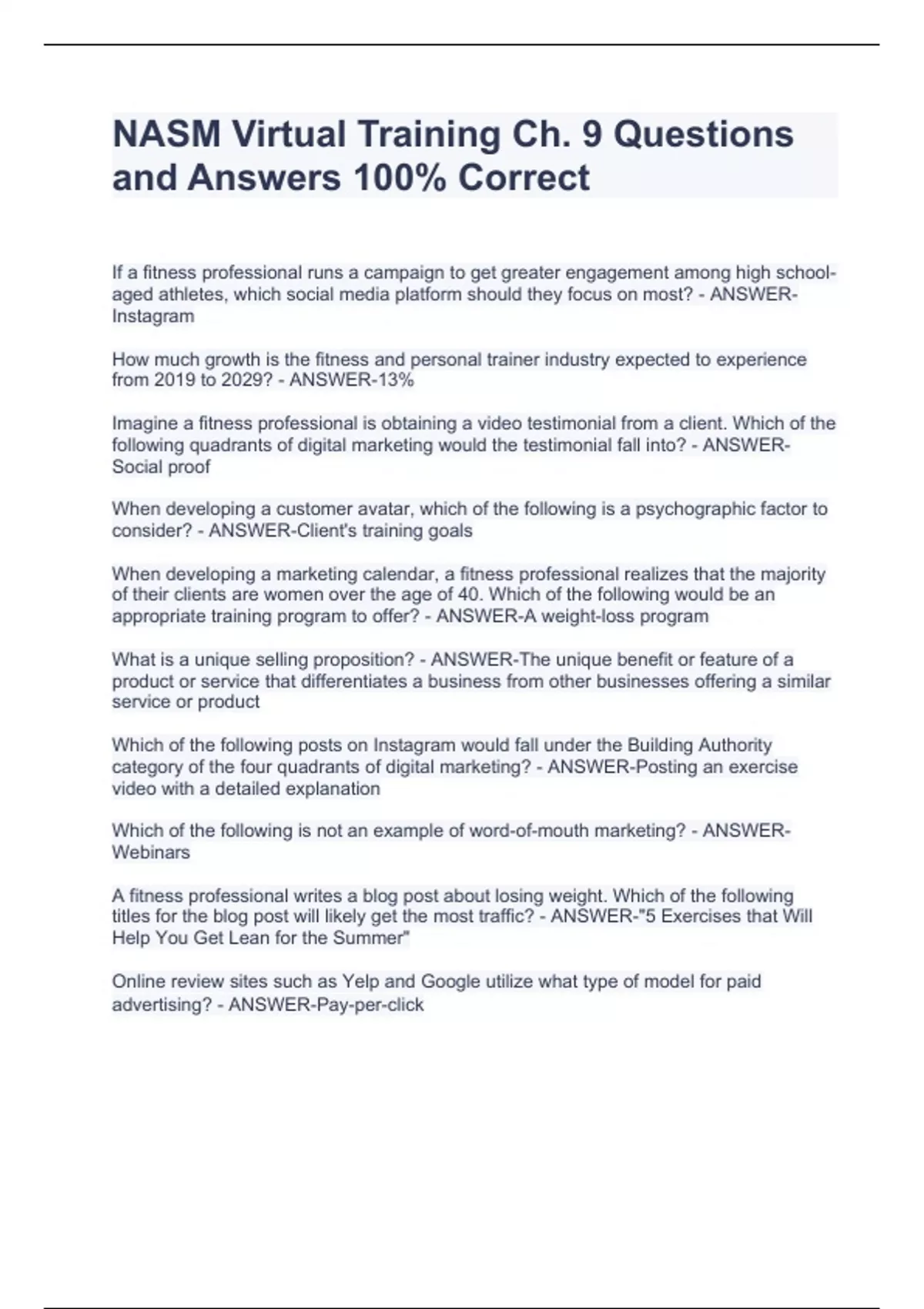NASM Virtual Training Ch. 9 Questions and Answers 100% CorrectNASM Virtual Training Ch. 9 Questions and Answers 100% CorrectNASM Virtual Training Ch. 9 Questions and Answers 100% CorrectNASM Virtual Training Ch. 9 Questions and Answers 100% CorrectNASM Virtual Training Ch. 9 Questions and Answers 100% Correct If a fitness professional runs a campaign to get greater engagement among high school-aged athletes, which social media platform should they focus on most? - ANSWER-Instagram How much growth is the fitness and personal trainer industry expected to experience from 2019 to 2029? - ANSWER-13%
