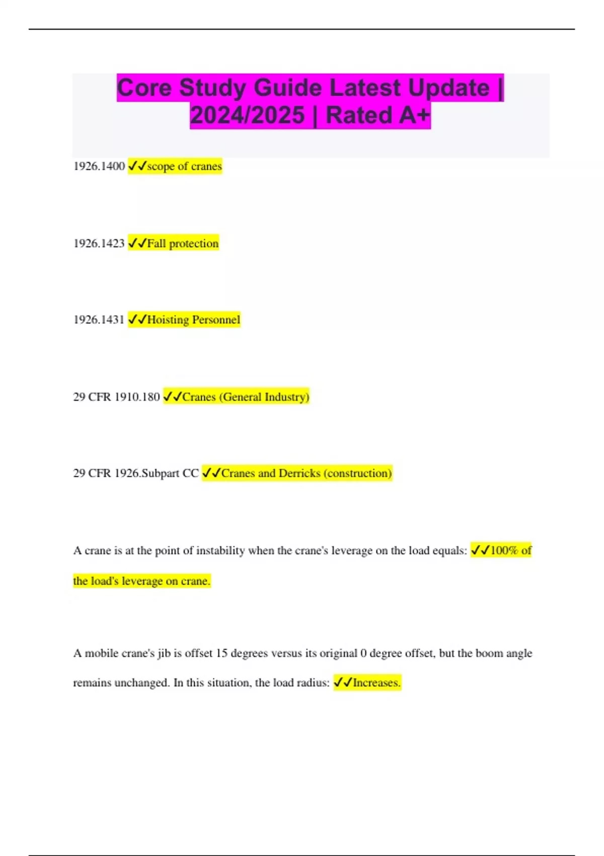 Core Study Guide Latest Update | 2024/2025 | Rated A+ 1926.1400 scope of cranes 1926.1423 Fall protection 1926.1431 Hoisting Personnel 29 CFR 1910.180 Cranes (General Industry) 29 CFR 1926.Subpart CC Cranes and Derricks (construction) A crane is at the point of instability when the crane's leverage on the load equals: 100% of the load's leverage on crane. A mobile crane's jib is offset 15 degrees versus its original 0 degree offset, but the boom angle remains unchanged. In this situation, the load radius: Increases. A sudden start or stop of the hoisting function while operating a mobile crane can produce a: Dynamic load. Abruptly stopping a rapid swing on a long-boom mobile crane will produce what major effect? Collapsing the boom. According to ASME which of the following listed below shall NOT be used for the suspension system on suspended personnel platforms? Synthetic web bridle. According to OSHA 1926.1408, for power lines rated 100 kV, the minimum clearance between the crane and any lines shall be? 15 feet w/encroachment precautions. According to OSHA 1926.1408, the minimum clearance between any part of the crane and power lines rated 50kV or below shall be: 10 feet w/encroachment precautions. According to OSHA 1926.1408, when operating near high voltage power lines, what clearance shall be required when the rating of the lines is 275kV? 20 feet w/encroachment precautions. According to OSHA 1926.1411, when you encounter power lines with a voltage of 44kV and the crane is TRAVELING, according to Table T, what is the minimum required clearance? 6 According to OSHA 1926.1431, at what wind speed must a qualified person be consulted? 20 mph. According to OSHA 1926.1431, during personnel platform hoisting operations, access gates shall NOT swing in which direction? Outward. According to OSHA 1926.1431, which device listed below must be attached to the crane? Anti-two-block. According to OSHA 1926.1431, which of these hoist options is prohibited? Hoist free fall. According to OSHA 1926.1431, while hoisting a personnel platform, what weather conditions listed below will promptly discontinue the operation? Dangerous. According to OSHA table T, what is the minimum clearance for 133kV power lines? 10 feet. According to OSHA where must a signal chart be