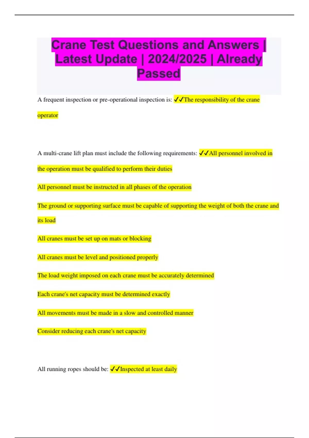 Crane Test Questions and Answers | Latest Update | 2024/2025 | Already Passed