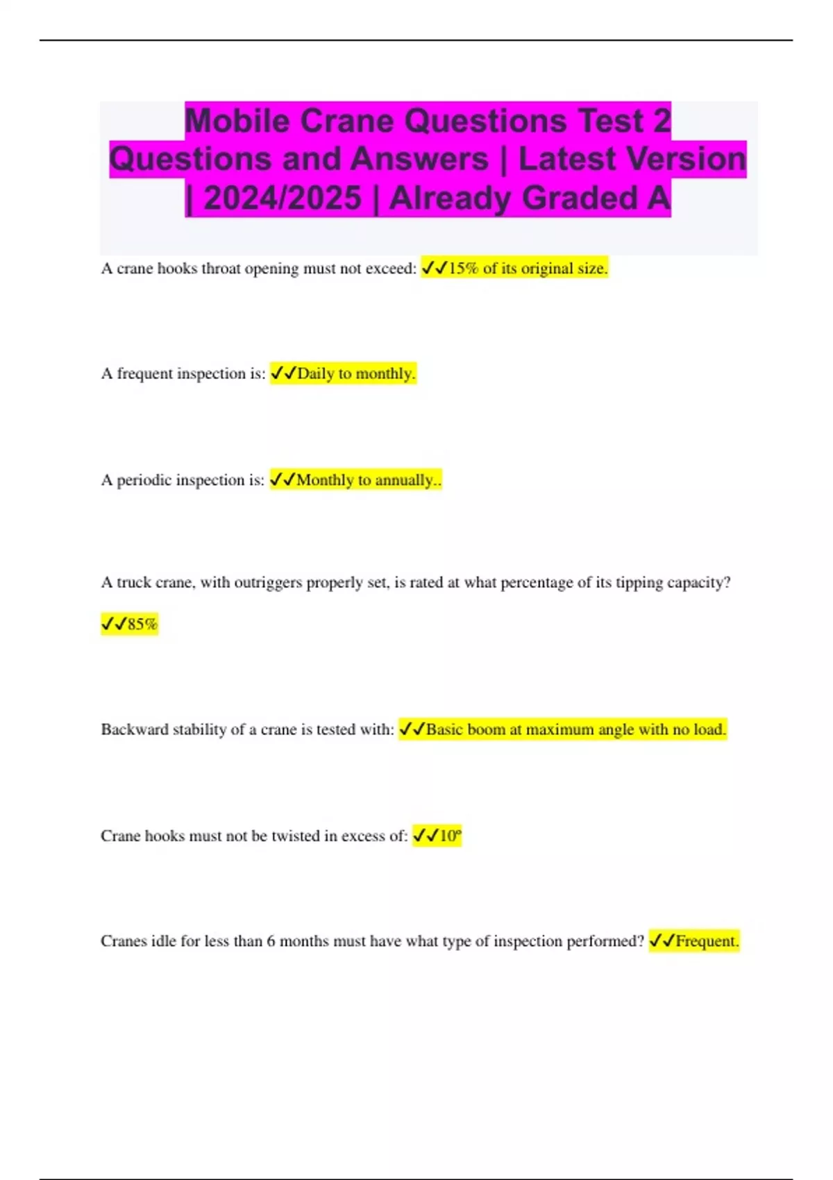 Mobile Crane Questions Test 2 Questions and Answers | Latest Version | 2024/2025 | Already Graded A
