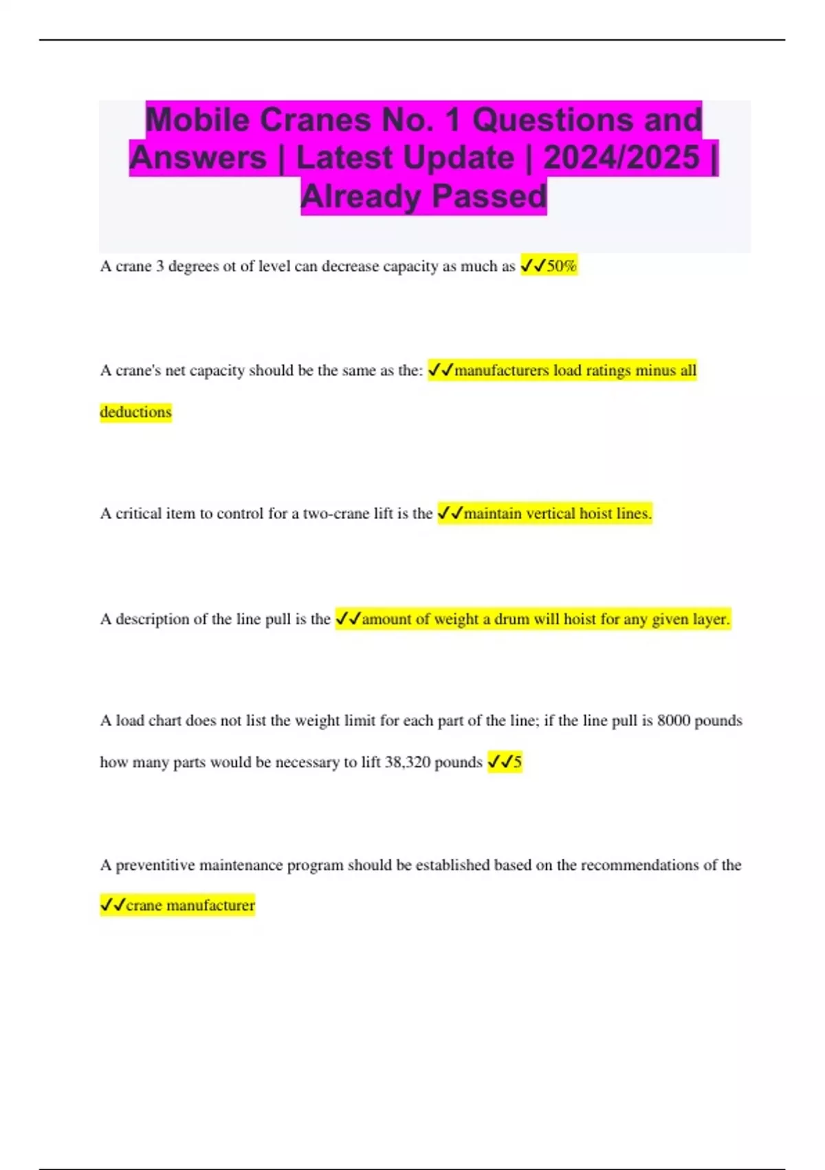 Mobile Cranes No. 1 Questions and Answers | Latest Update | 2024/2025 | Already Passed A crane 3 degrees ot of level can decrease capacity as much as 50% A crane's net capacity should be the same as the: manufacturers load ratings minus all deductions A critical item to control for a two-crane lift is the maintain vertical hoist lines. A description of the line pull is the amount of weight a drum will hoist for any given layer. A load chart does not list the weight limit for each part of the line; if the line pull is 8000 pounds how many parts would be necessary to lift 38,320 pounds 5 A preventitive maintenance program should be established based on the recommendations of the crane manufacturer A suspended personnel platform should not be used when the wind reaches 20 mph A thick dark line running across a load chart means that the load listed: above the line are limited by structural factors A thick dark line running across the load chart means that the load listings: Above the lines are limited by structural factors. A work area chart is used to: Identify capacity changes due to operational quadrants. According to B30.5 determing the correct weight of the load to be lifted by a crane is the responsibiltiy of the site supervisor, According to federal regulations, the minimum distance between any part of the crane or load, and a power line rated 50kv is 10 feet According to OSHA, during assembly who must address hazards associated with the operation A/D Supervisor According to the B30.5 a signal person is required to observe power lines when the crane is within a boom's length of the limit of approach. All hazards and problems that are found on the worksite should be identified: at the preoperational worksite inspection An anti-2-block damage of prevention system will: Prevent any crane movements that will cause a 2-block condition. An auxiliary boom head is intended to be used with: A whip line. An example of duty cycle crane operations would be: The handling of personnel baskets. An operator working in a new construction area should confirm the surface's ability to support anticipated loads by consulting the site supervisor Any power line is considered energized unless the electrical