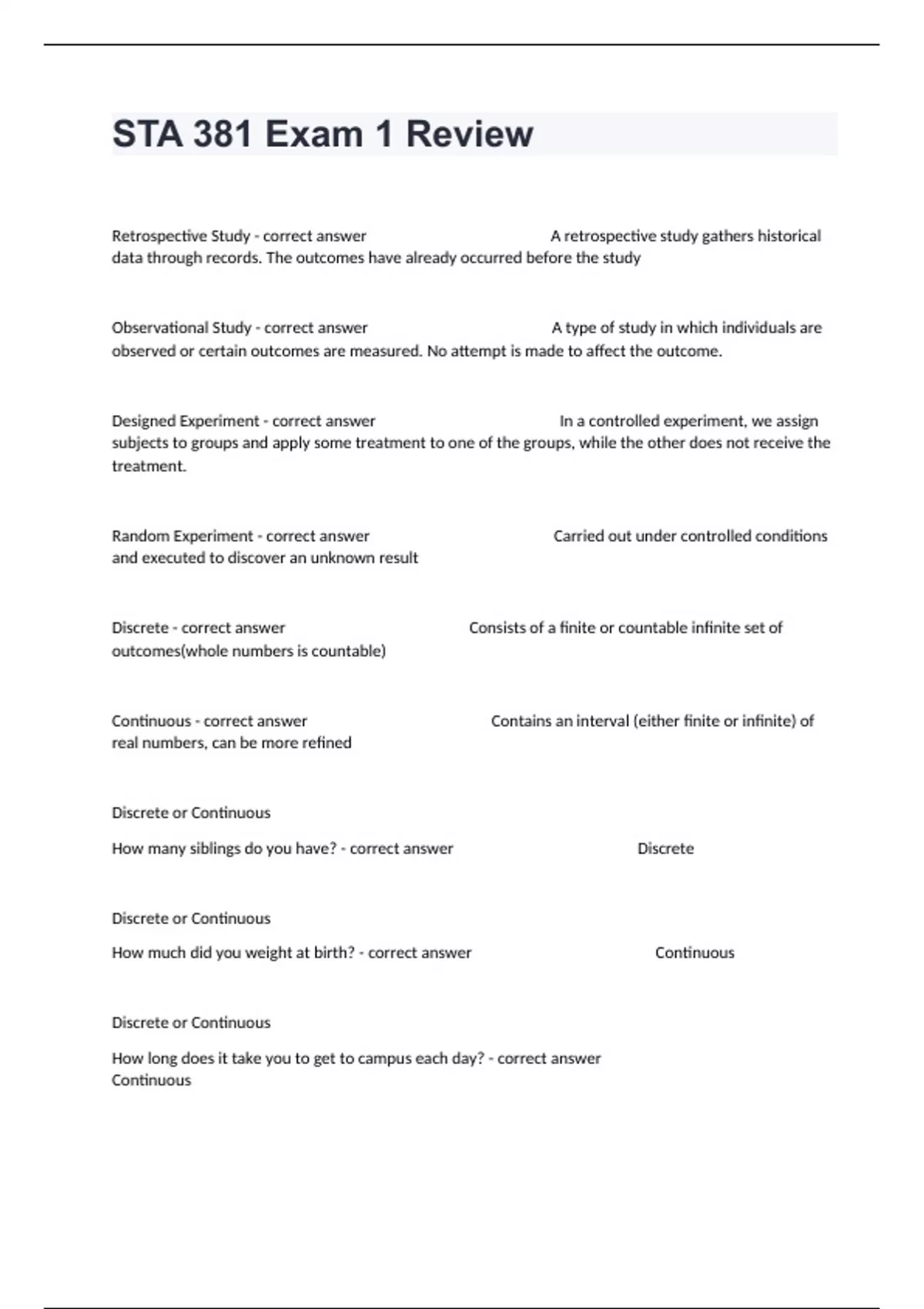 Retrospective Study - correct answer A retrospective study gathers historical data through records. The outcomes have already occurred before the study Observational Study - correct answer A type of study in which individuals are observed or certain outcomes are measured. No attempt is made to affect the outcome. Designed Experiment - correct answer In a controlled experiment, we assign subjects to groups and apply some treatment to one of the groups, while the other does not receive the treatment. Random Experiment - correct answer Carried out under controlled conditions and executed to discover an unknown result Discrete - correct answer Consists of a finite or countable infinite set of outcomes(whole numbers is countable) Continuous - correct answer Contains an interval (either finite or infinite) of real numbers, can be more refined Discrete or Continuous How many siblings do you have? - correct answer Discrete Discrete or Continuous How much did you weight at birth? - correct answer Continuous Discrete or Continuous How long does it take you to get to campus each day? - correct answer Continuous Discrete or Continuous How many times do you exercise each week? - correct answer Discrete Discrete or Continuous How many classes are you taking? - correct answer Discrete Discrete or Continuous How many car accidents have you been in? - correct answer Discrete