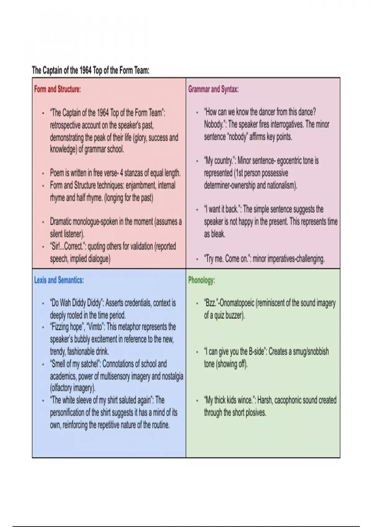 - Form and Structure techniques: enjambment, internal determiner-ownership and nationalism).