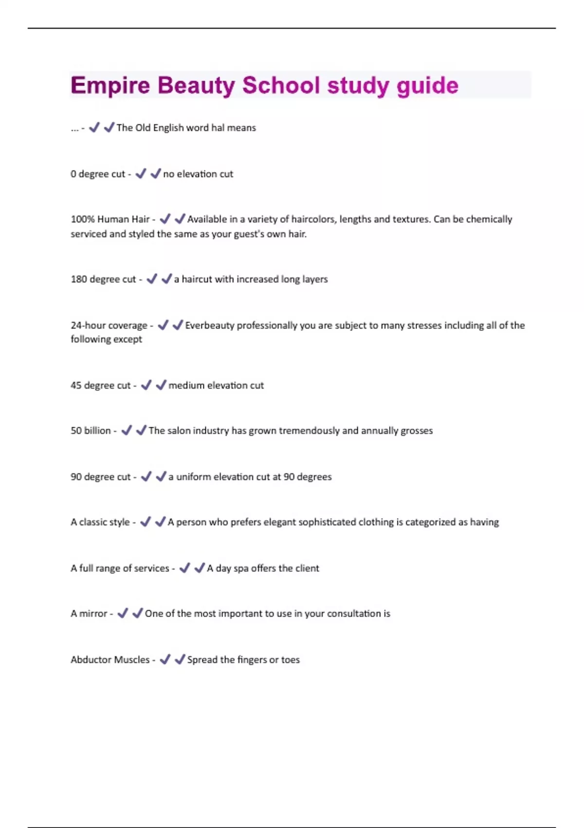 ... - The Old English word hal means 0 degree cut - no elevation cut 100% Human Hair - Available in a variety of haircolors, lengths and textures. Can be chemically serviced and styled the same as your guest's own hair. 180 degree cut - a haircut with increased long layers 24-hour coverage - Everbeauty professionally you are subject to many stresses including all of the following except 45 degree cut - medium elevation cut 50 billion - The salon industry has grown tremendously and annually grosses 90 degree cut - a uniform elevation cut at 90 degrees A classic style - A person who prefers elegant sophisticated clothing is categorized as having A full range of services - A day spa offers the client A mirror - One of the most important to use in your consultation is Abductor Muscles - Spread the fingers or toesAbraded Hair - The technical term for broken hair or excessive stretching or traction of the hair Absorption - Allows products to penetrate the skin to keep it supple & pliable, which helps the skin to retain its stretch &/or elasticity Absorption - The skins ability to permit substances like water and oxygen to pass through its tissues Accelerated Hydrogen Peroxide (AHP) - Disinfectant based on a stabilized hydrogen peroxide that is non-toxic to the skin and environment; this type of disinfectant only needs to be changed every 14 days. Accentuate your best features - When applying makeup to go to work it is best to always remember when applying makeup to Acid - Ranges from 0 to 6.9 on the pH scale. Acid - Water-Based solution measuring more positive hydrogen ions the negative ions , measures less than 7 on the PH scale Acid Balanced Waves - Permanent waves processed without heat that have a pH ranging between 7.0 to 8.2; produce a firmer curl & process more quickly than true acid waves Acid Mantle - A layer of oil and swear found the sebaceous glands keeps the skin smooth prevents dirt and grime from entering the outer layer of the epidermis and also prevents the skin from drying or chapping; protects the cuticle or outer covering of the hair fiber and maintains the acid balance of the skin Acid- Balanced Rinse - Used to close the cuticle after a color service to prevent the color from fadingAcidic Solutions - Contain more hydrogen ions, contract and harden the hair and have a sour taste. Acne - Also known as acne vulgaris; skin disorder characterized by chronic inflammation of the sebaceous glands from retained secretions and propionibacterium acnes bacteria.
