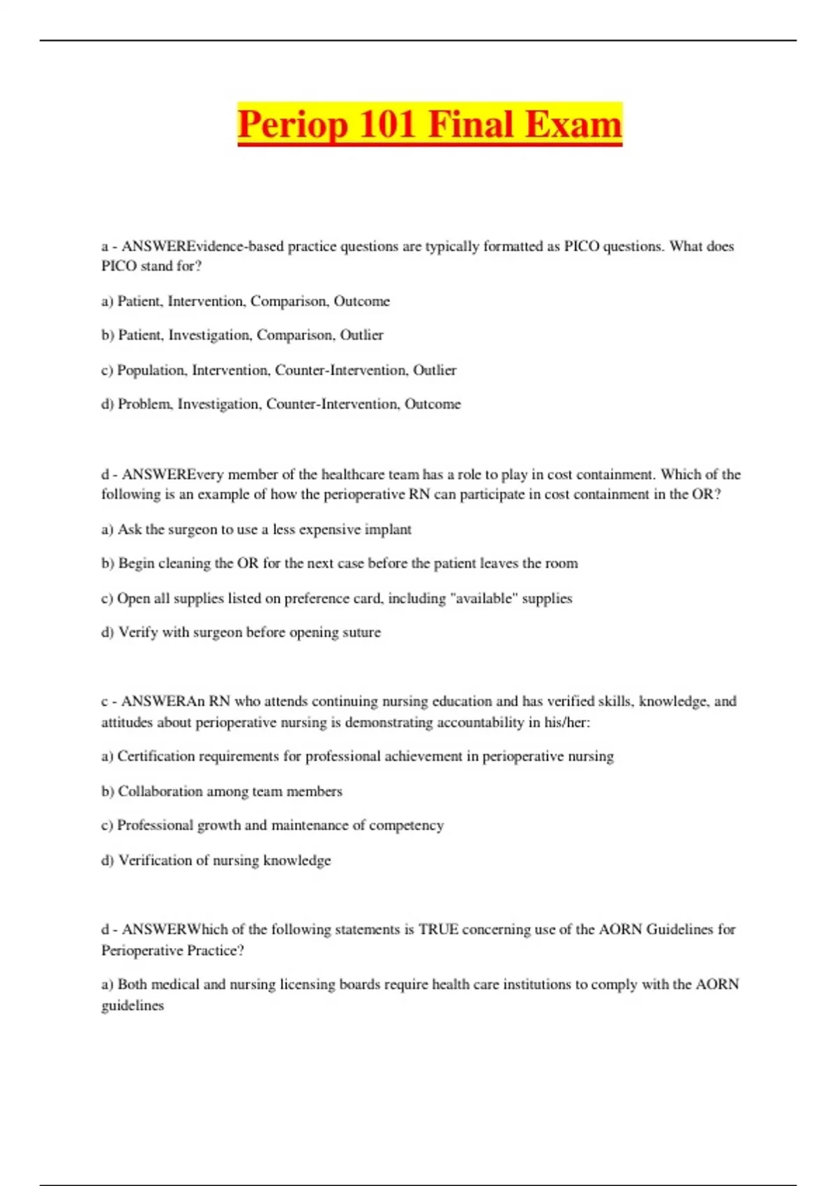 Periop 101 Final Exam Spring 2024 (Actual test 100% verified,highly rated exam) a - Answer ️️ -Evidence-based practice questions are typically formatted as PICO questions. What does PICO stand for? a) Patient, Intervention, Comparison, Outcome b) Patient, Investigation, Comparison, Outlier c) Population, Intervention, Counter-Intervention, Outlier d) Problem, Investigation, Counter-Intervention, Outcome d - Answer ️️ -Every member of the healthcare team has a role to play in cost containment. Which of the following is an example of how the perioperative RN can participate in cost containment in the OR? a) Ask the surgeon to use a less expensive implant b) Begin cleaning the OR for the next case before the patient leaves the room c) Open all supplies listed on preference card, including