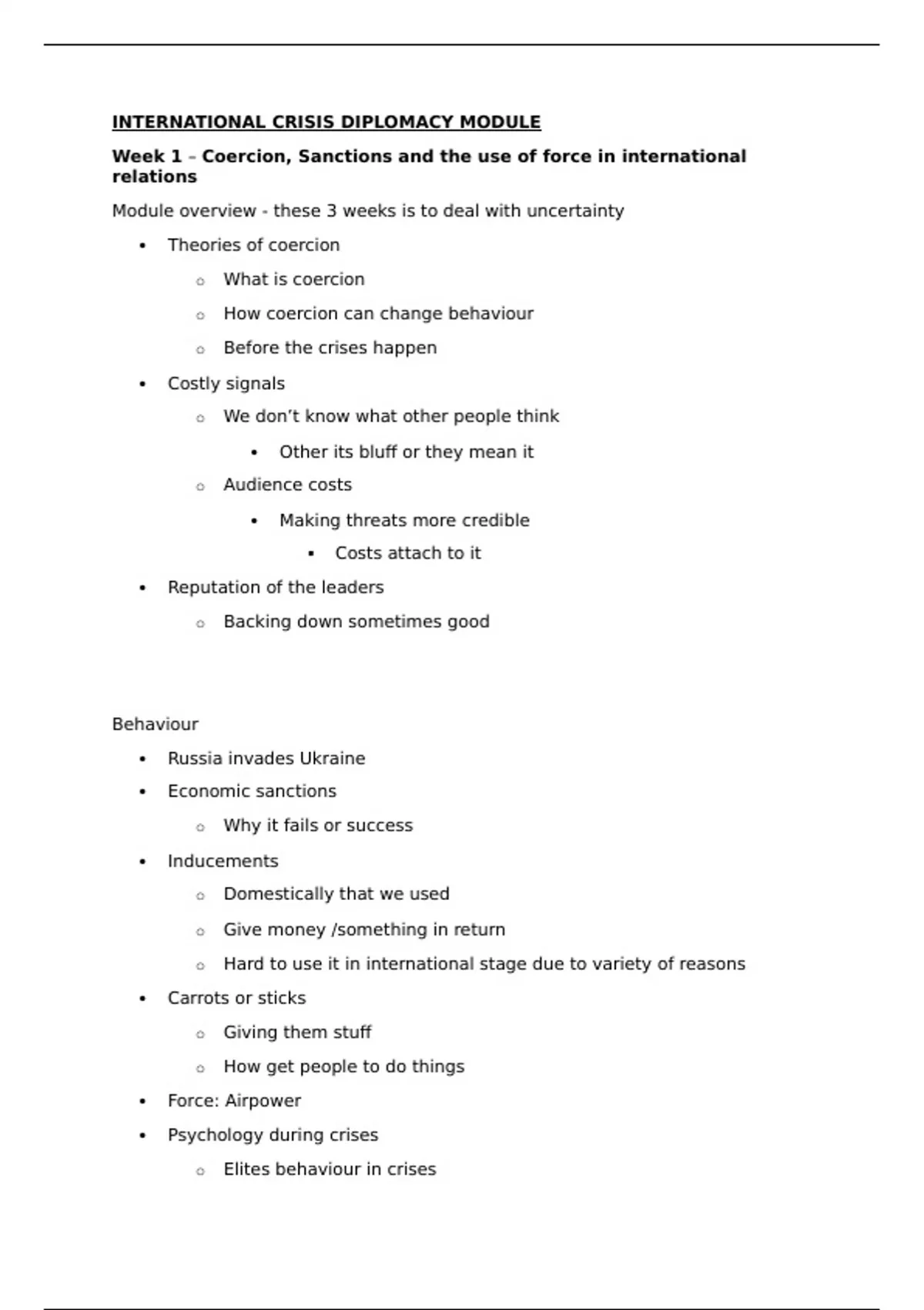 Introduction to crisis diplomacy in regards to how coercion is being used and the mechanisms of bluffing and uncertainty in international relations.