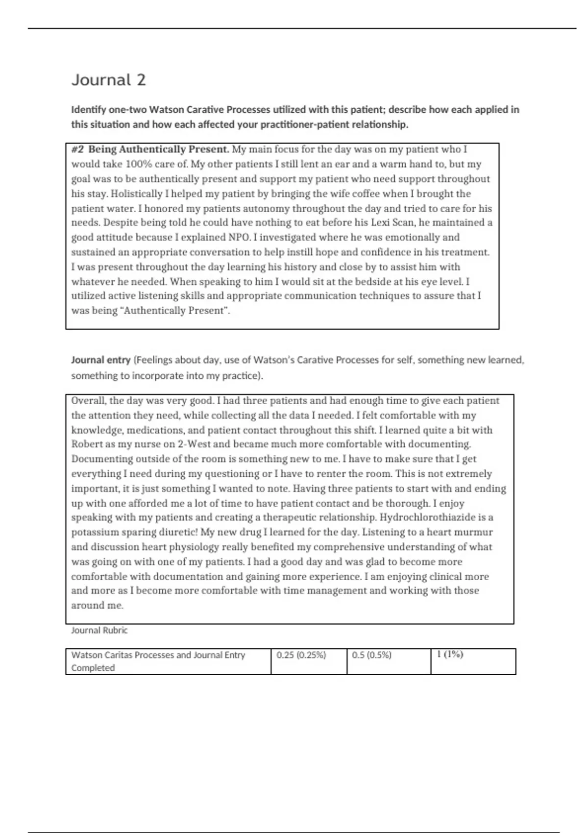 Journal entry (Feelings about day, use of Watson’s Carative Processes for self, something new learned,
