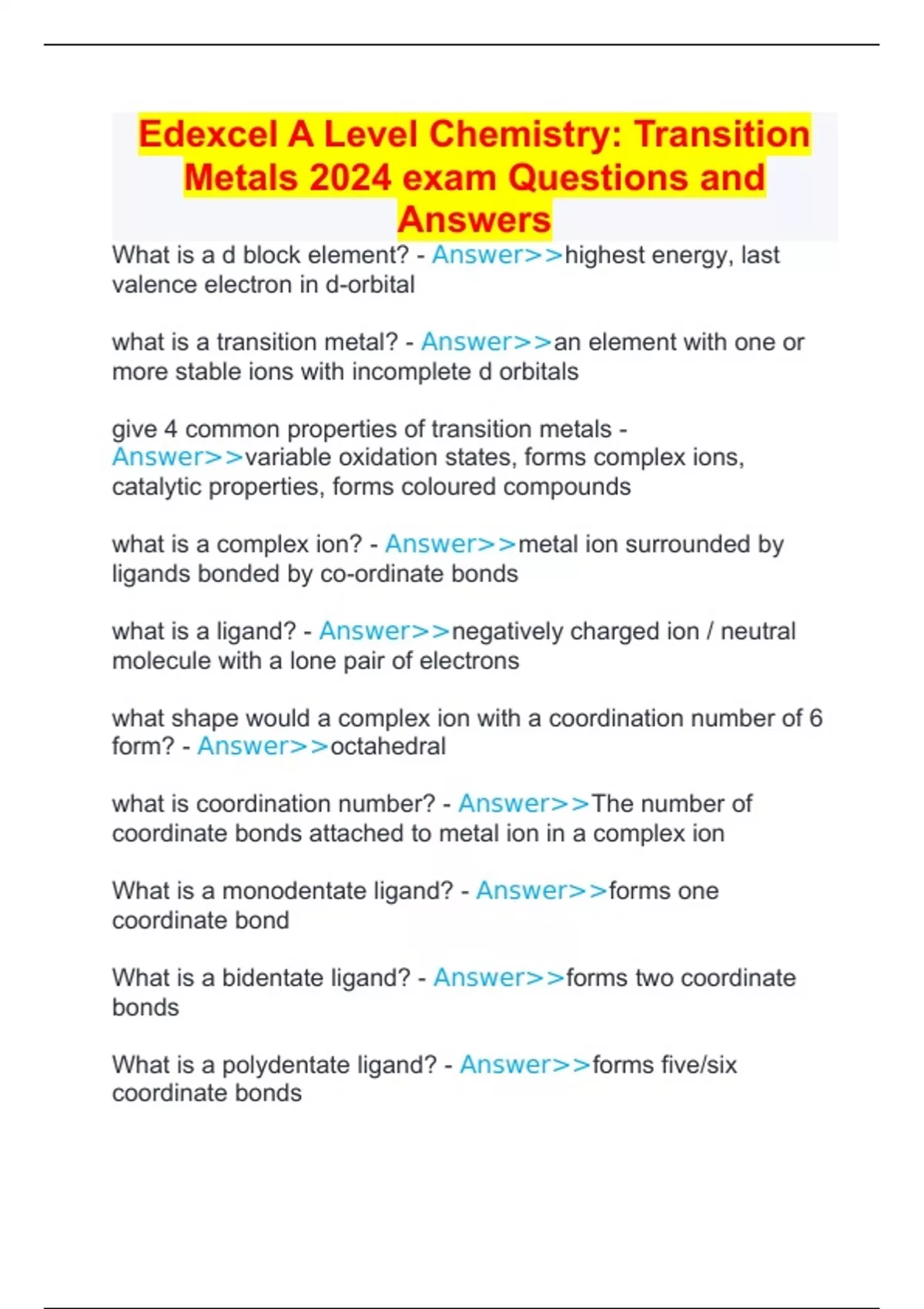 Edexcel A Level Chemistry: Transition Metals 2024 exam Questions and Answers