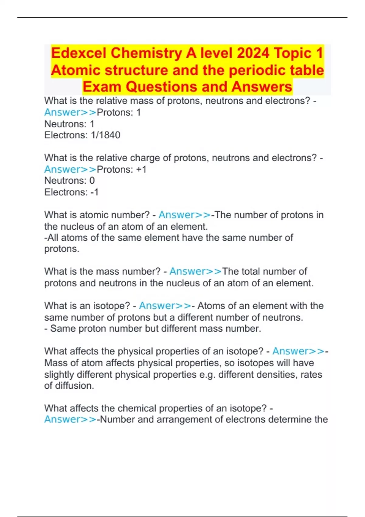 Edexcel Chemistry A level 2024 Topic 1 Atomic structure and the periodic table Exam Questions and Answers