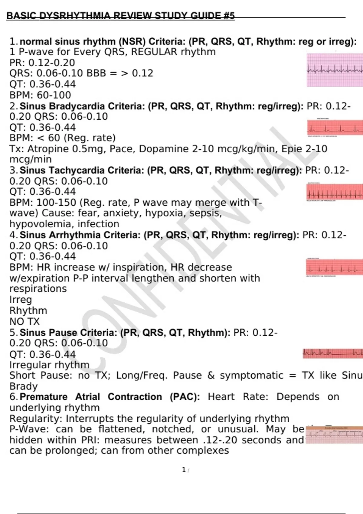 1. normal sinus rhythm (NSR) Criteria: (PR, QRS, QT, Rhythm: reg or irreg):