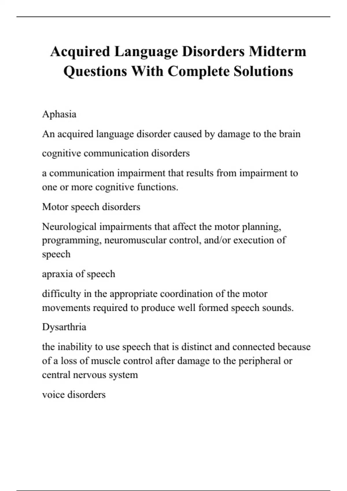 Acquired Language Disorders Midterm Questions With Complete Solutions
