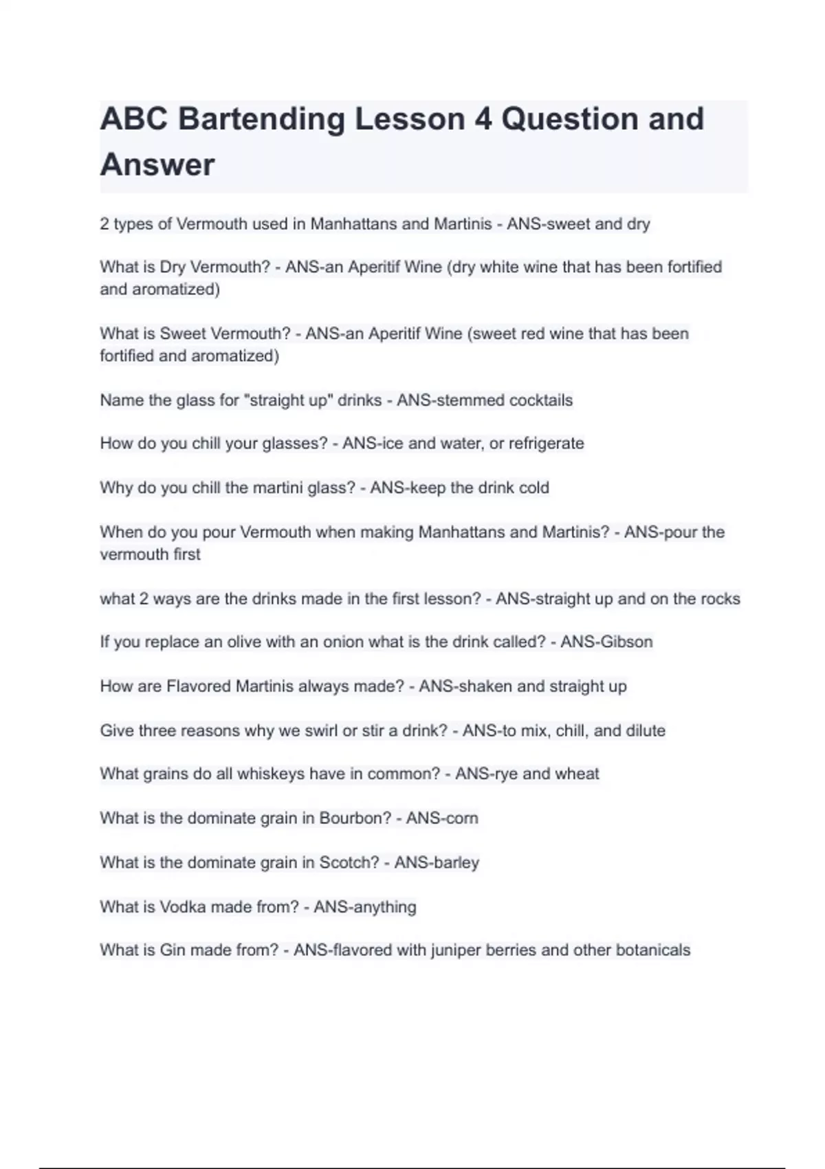 ABC Bartending Lesson 4 Question and