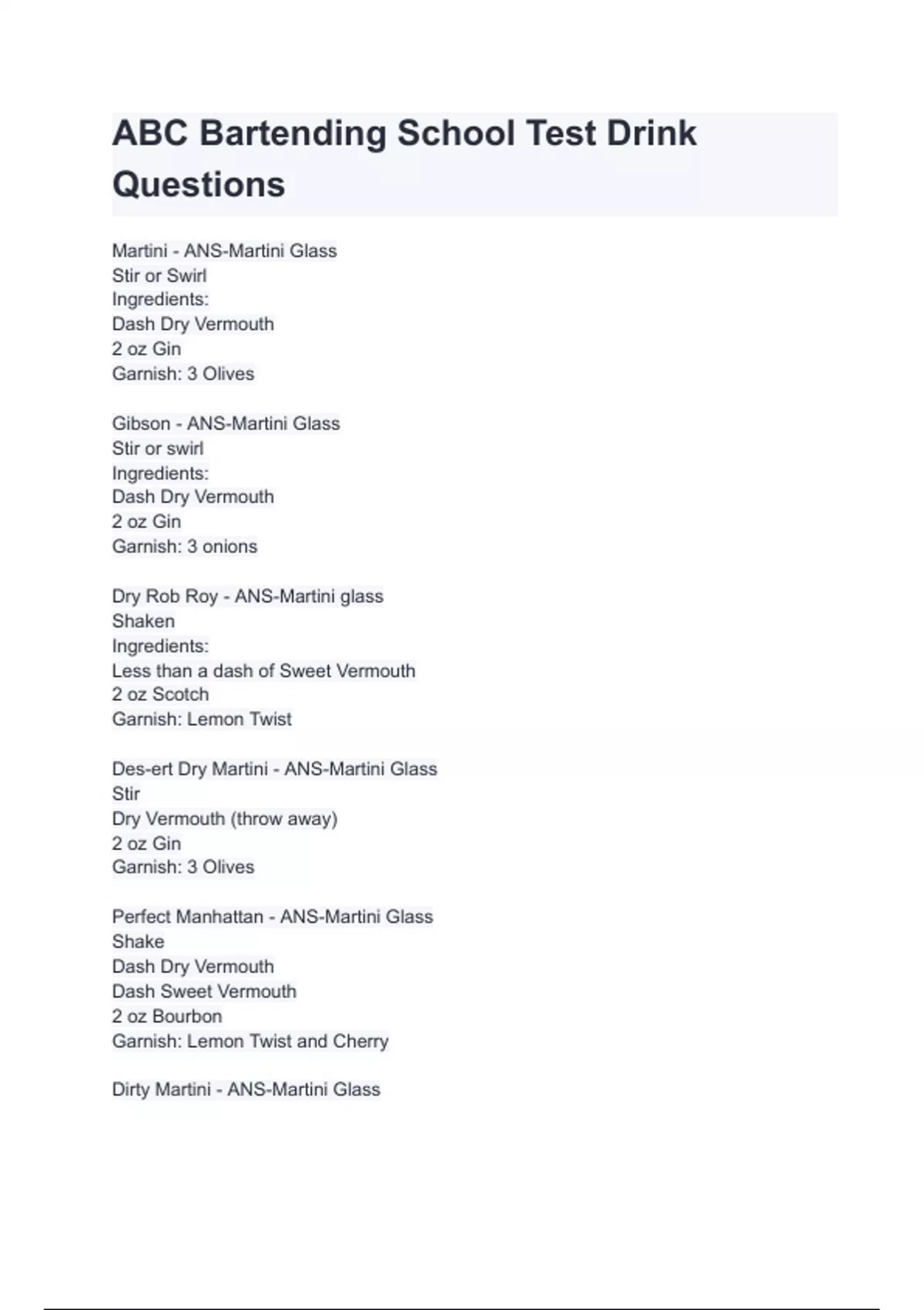 ABC Bartending School Test Drink Questions
