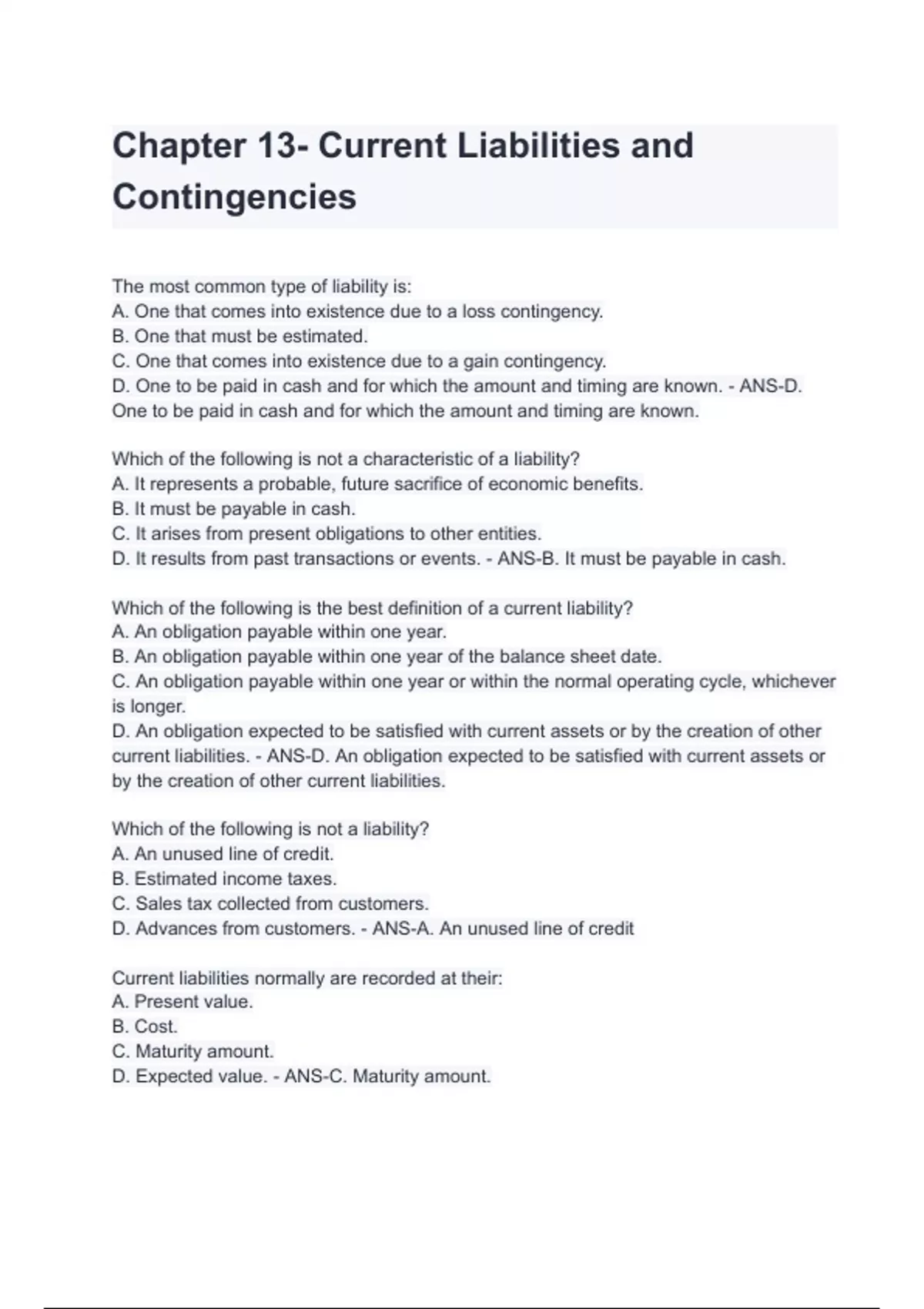 D. It results from past transactions or events. - ANS-B. It must be payable in cash.