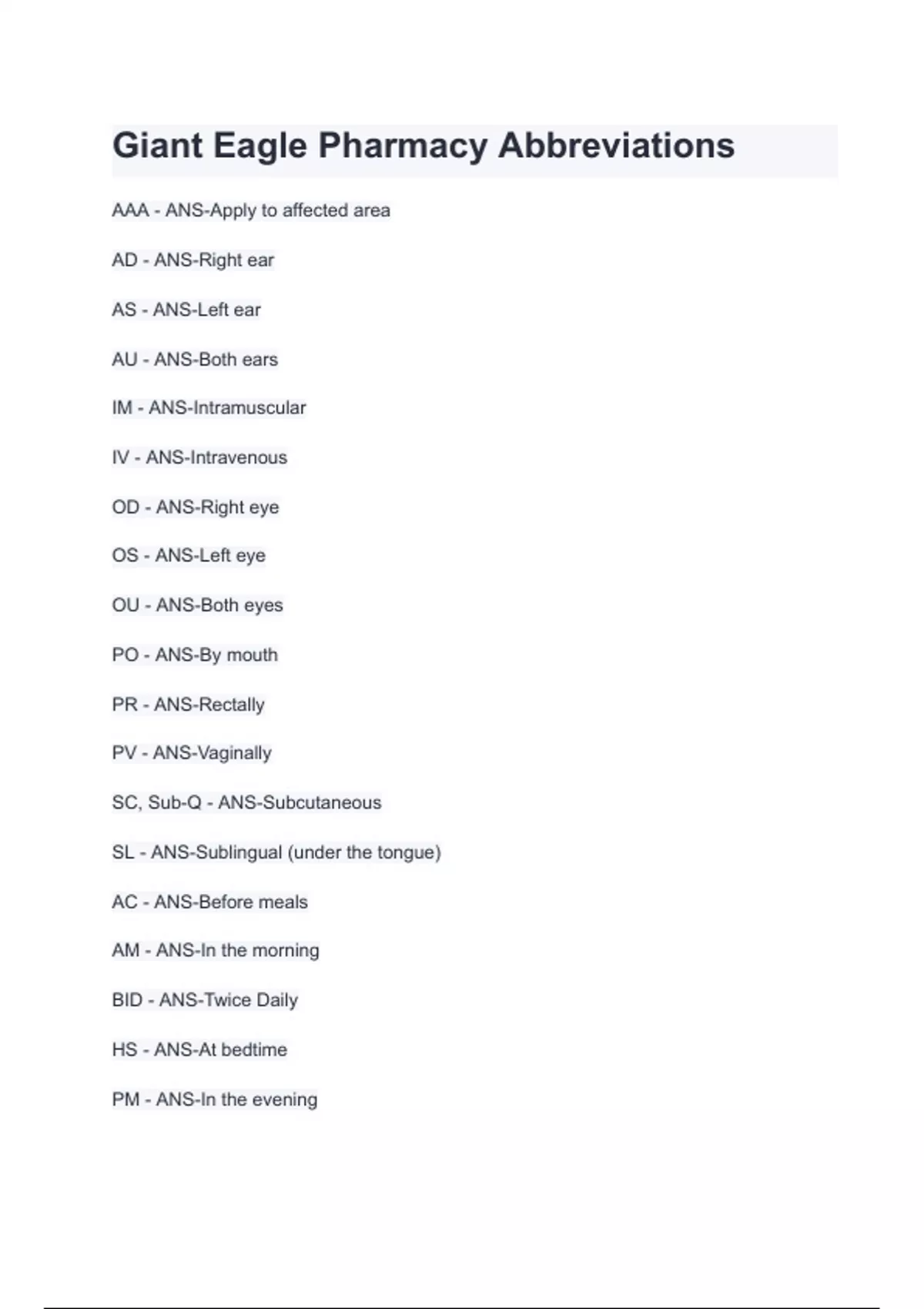 Giant Eagle Pharmacy Abbreviations